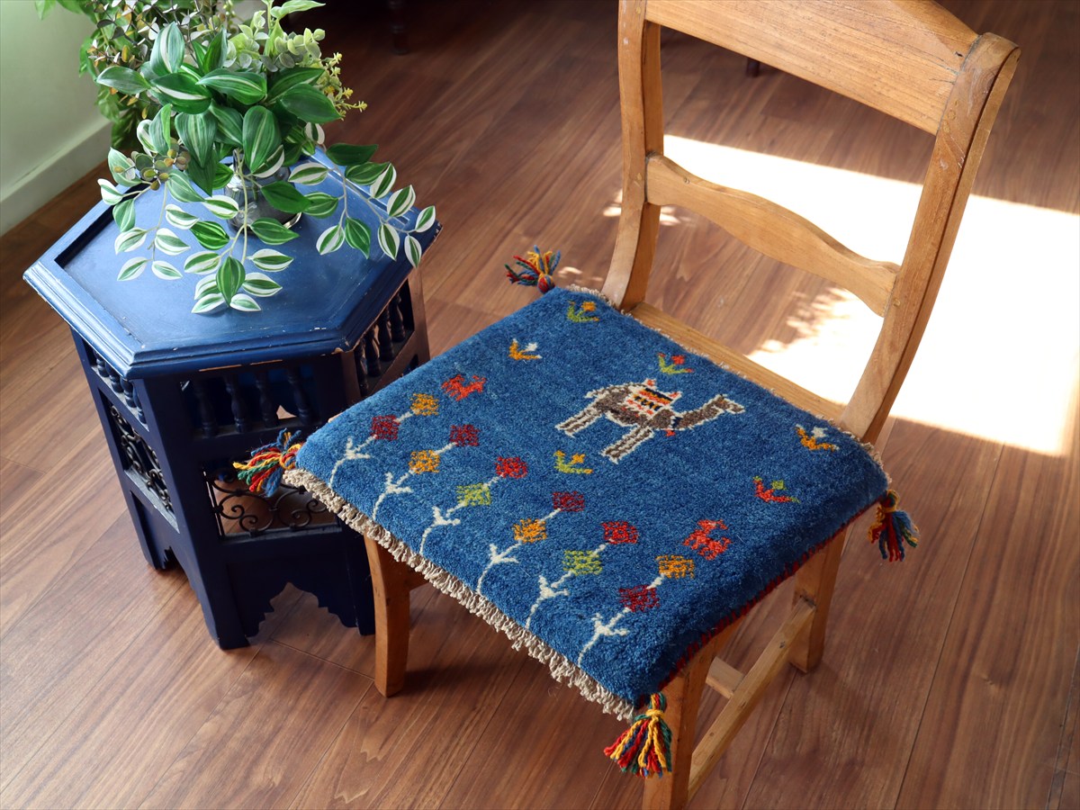 - ギャッベ イラン産手織り 座布団サイズ 38×44cm ブルー ラクダと動物とフラワーデザイン