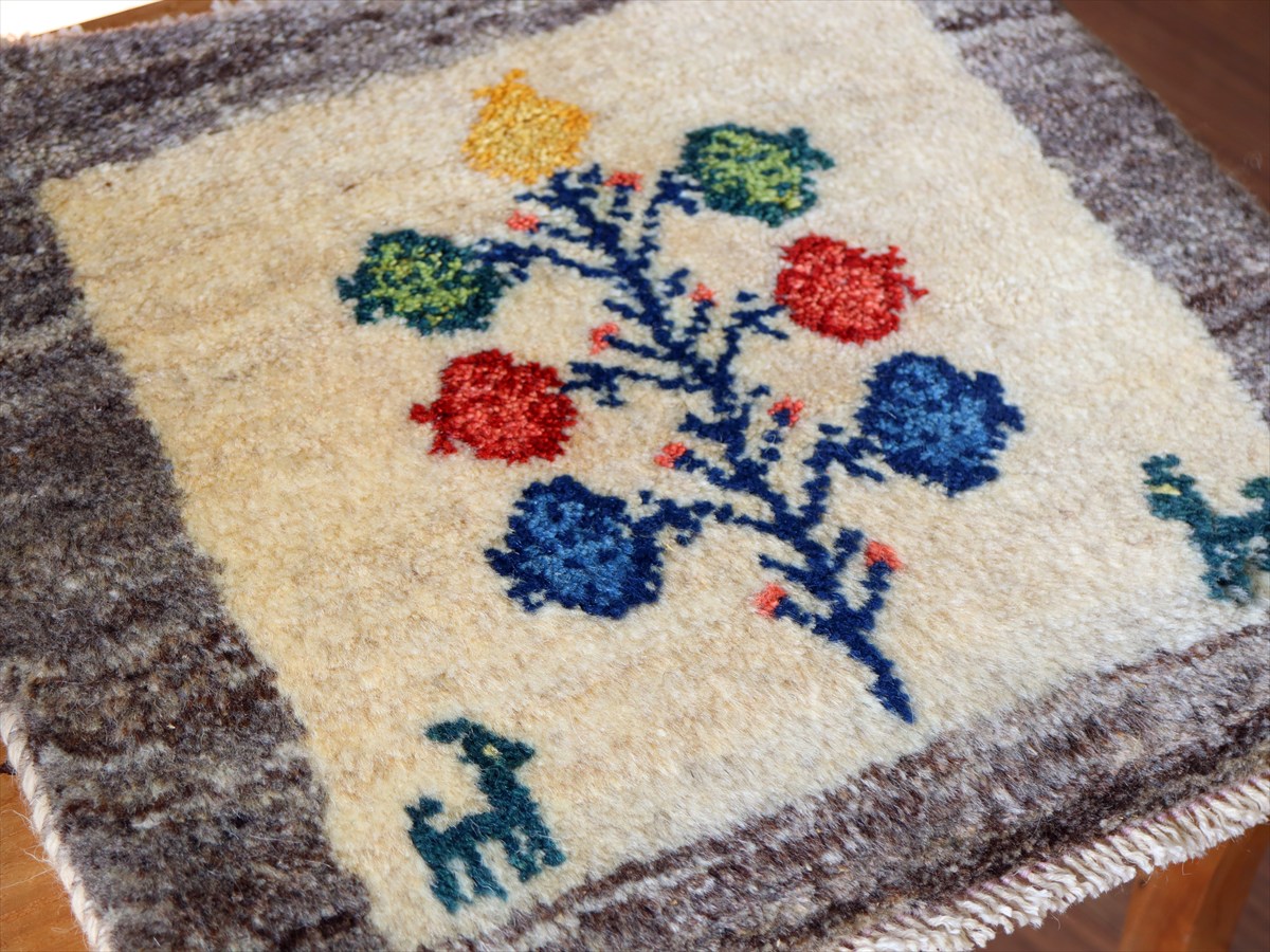 ギャッベ イラン産手織り 座布団サイズ 39×41cm ナチュラルアイボリー 動物とカラフルなザクロの樹