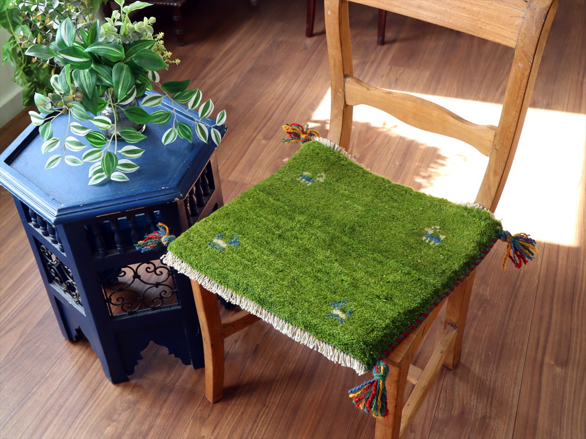 Key:イラン直輸入, GABBEH, ギャッベ, ギャベ, グリーン, 緑, 手織り, 手紡ぎ, ウール, 天然素材, ポンポン, 座布団, バザールギャッベ, ハンドメイド, 一点もの, 現品販売,ガラタバザール, 東京中野区