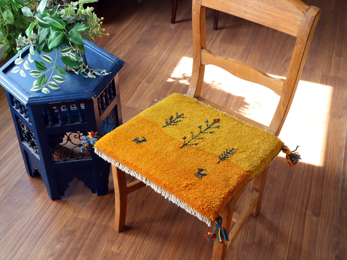 - ギャッベ イラン産手織り 座布団サイズ 38×43cm イエローオレンジ 動物と生命の樹 風景画