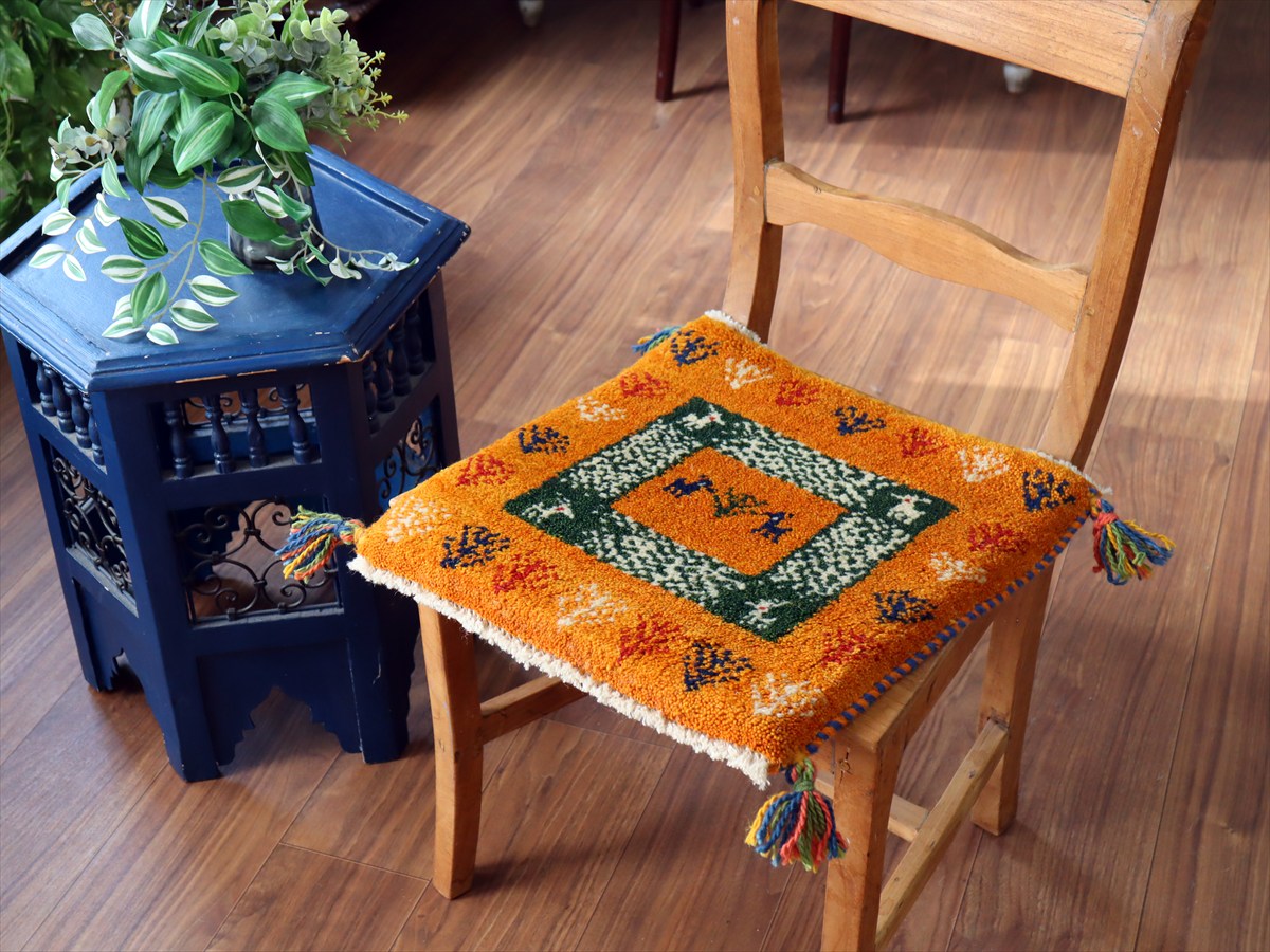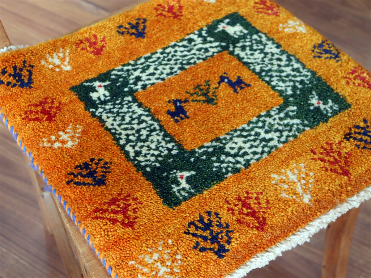 ギャッベ イラン産手織り 座布団サイズ 40×41cm オレンジ 生命の樹と動物 タイルデザイン
