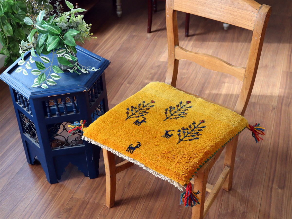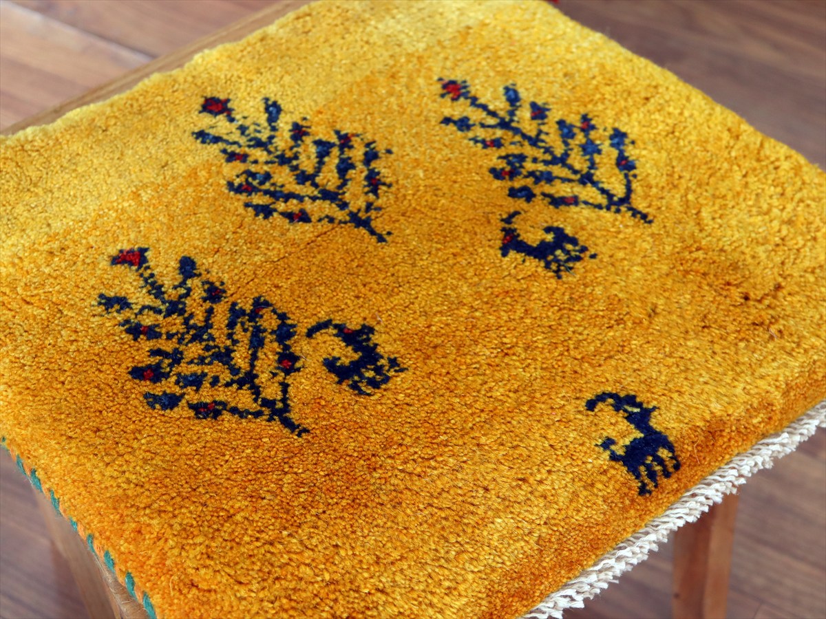 - ギャッベ イラン産手織り 座布団サイズ 41×43cm イエローオレンジ 動物と生命の樹