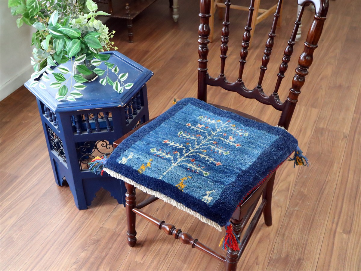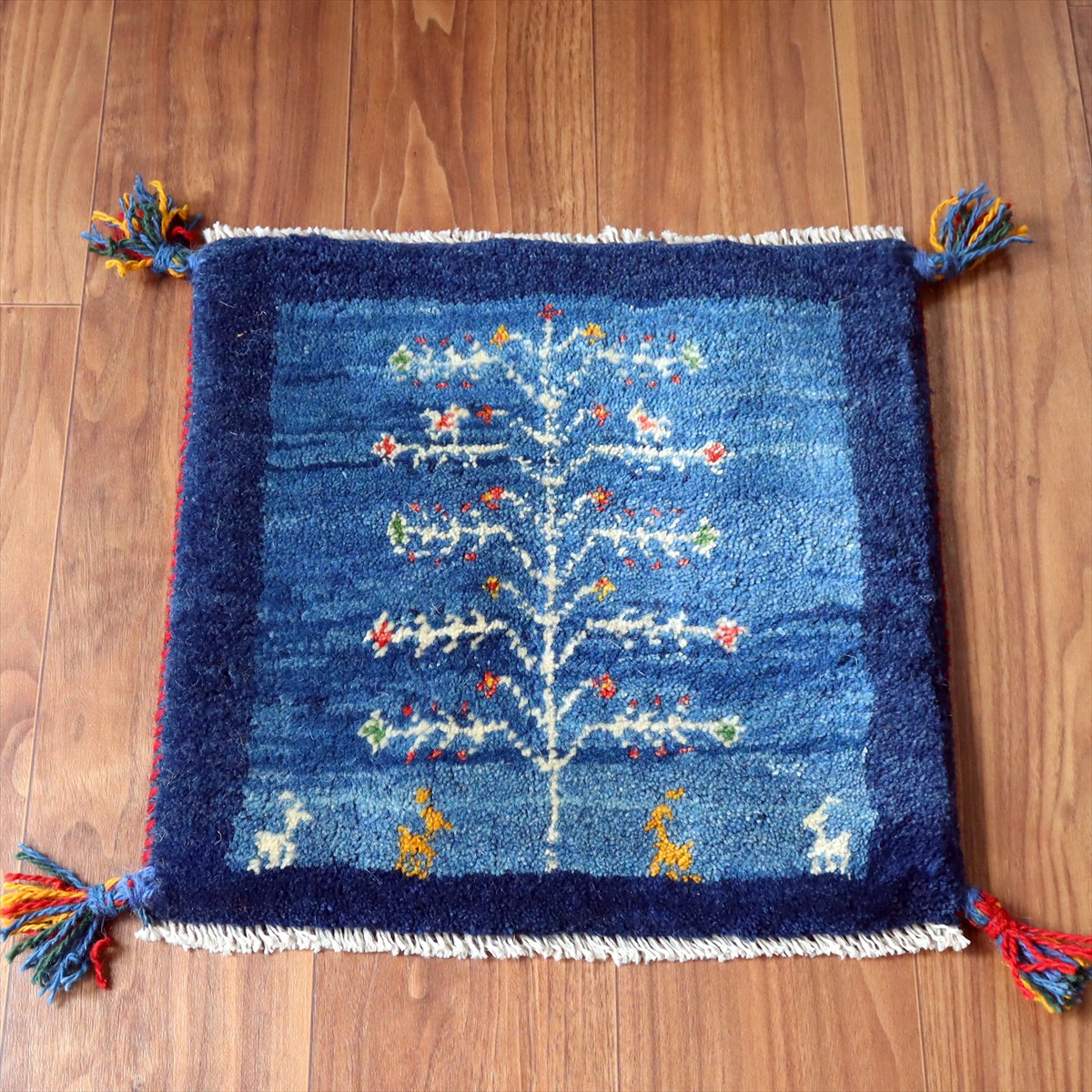 ギャッベ イラン産手織り 座布団サイズ 42×42cm ブルー 動物と生命の樹