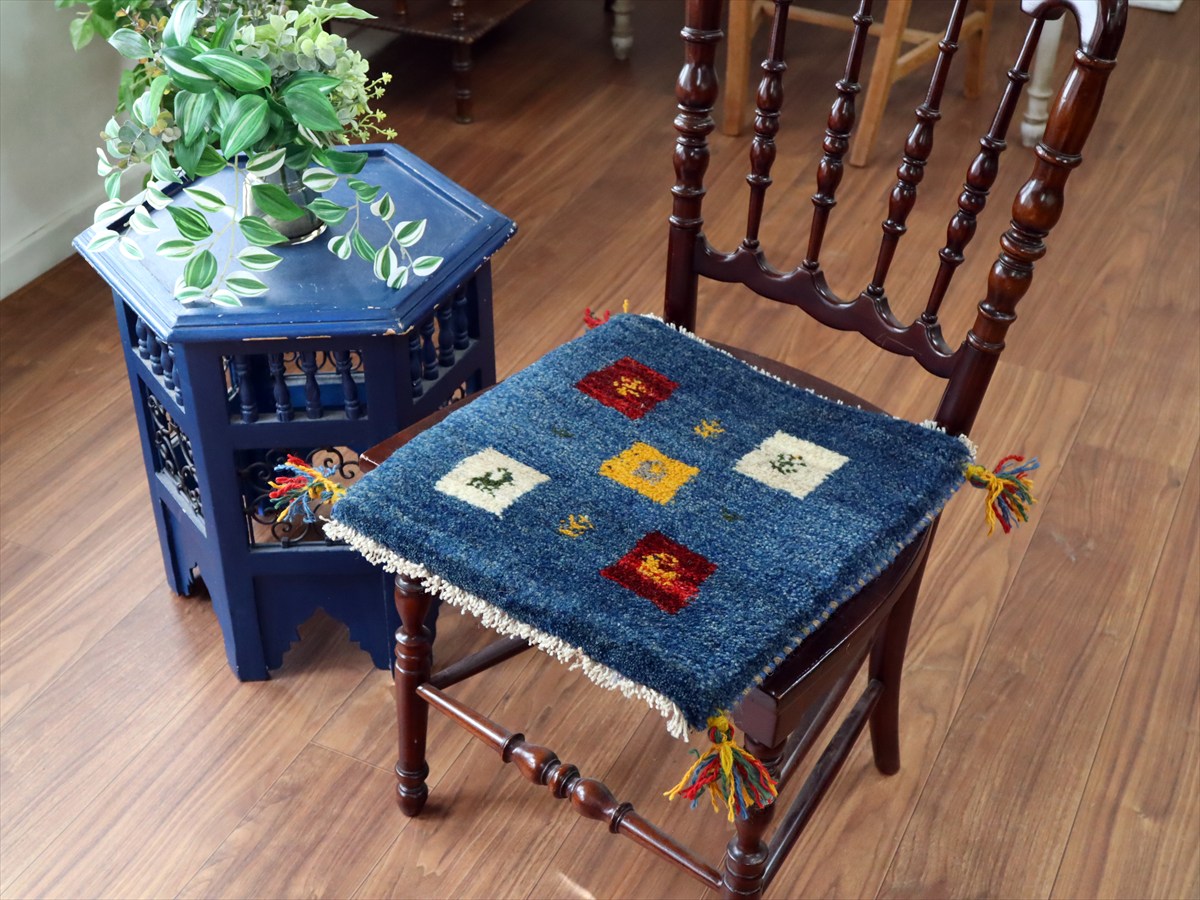 ギャッベ イラン産手織り 座布団サイズ 41×40cm ブルー カラフルタイル 動物と生命の樹