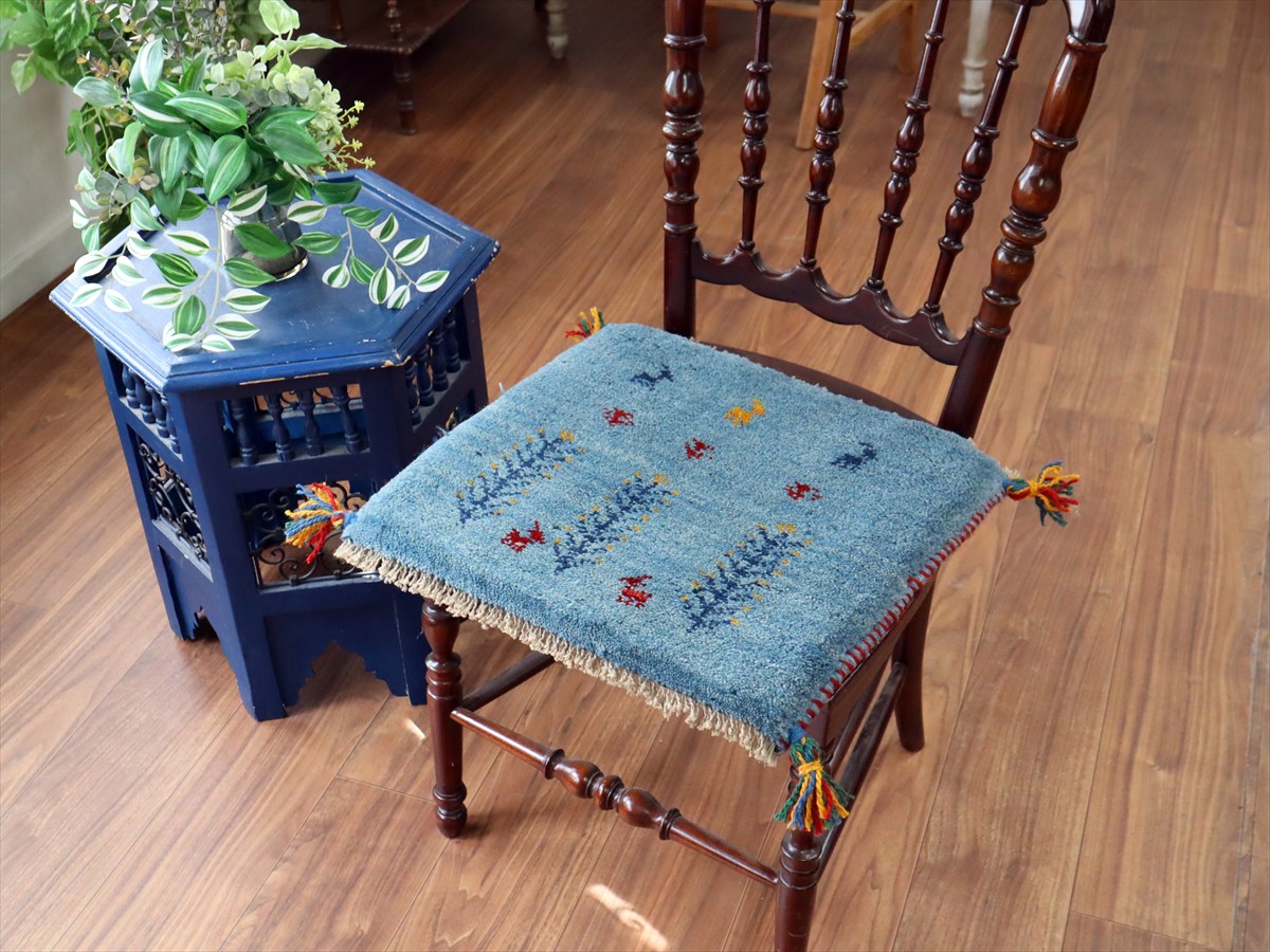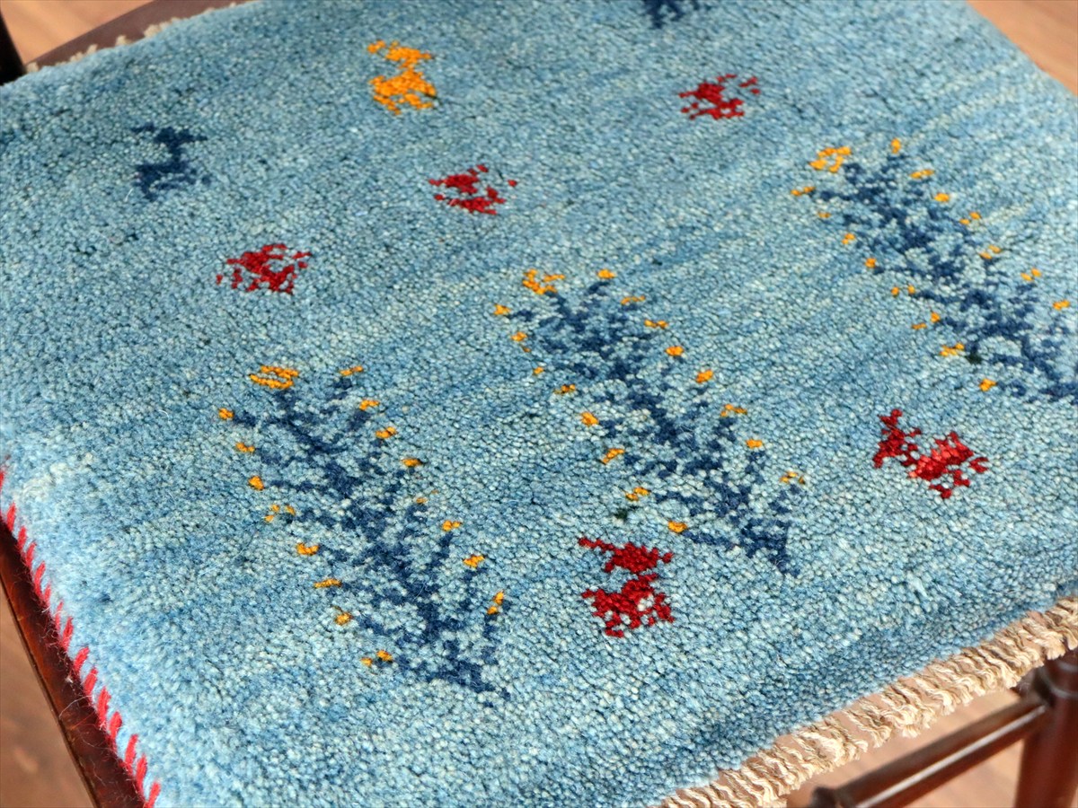 ギャッベ イラン産手織り 座布団サイズ 40×44cm アクアブルー 動物と連なる生命の樹