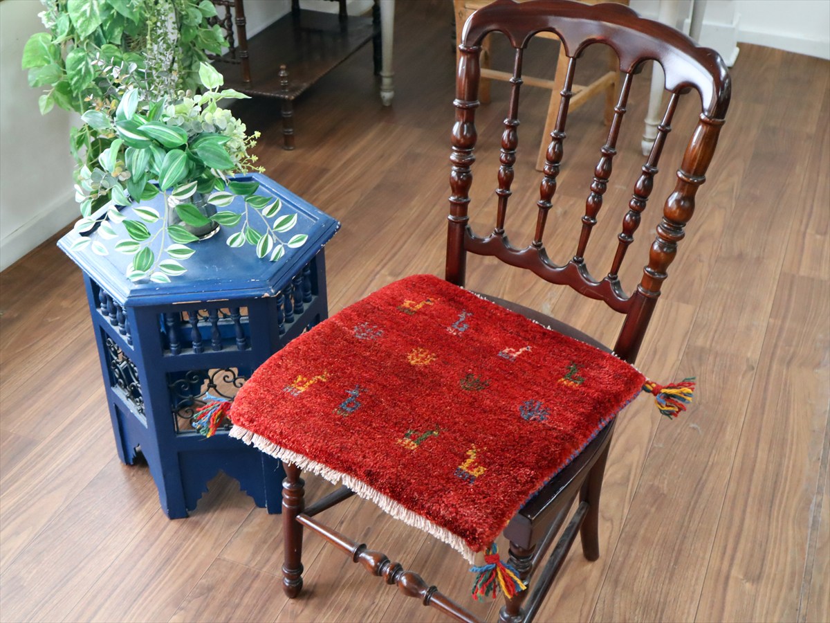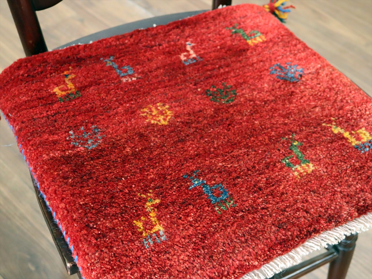 - ギャッベ イラン産手織り 座布団サイズ 42×42cm レッド カラフルな生命の樹と動物