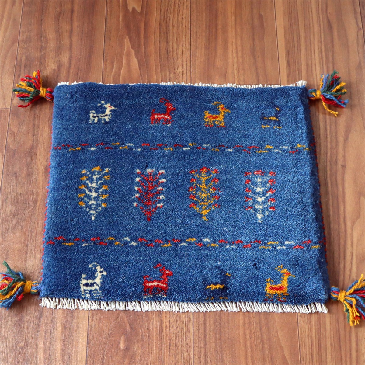 ギャッベ イラン産手織り 座布団サイズ 37×43cm ブルー 動物と連なる生命の樹