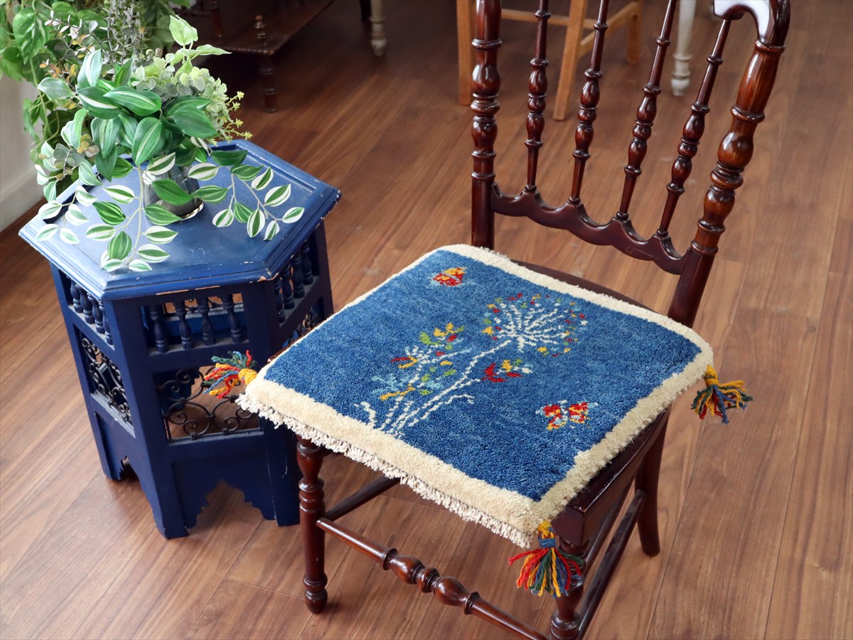 ギャッベ イラン産手織り 座布団サイズ 40×42cm ブルー 蝶々とフラワーデザイン