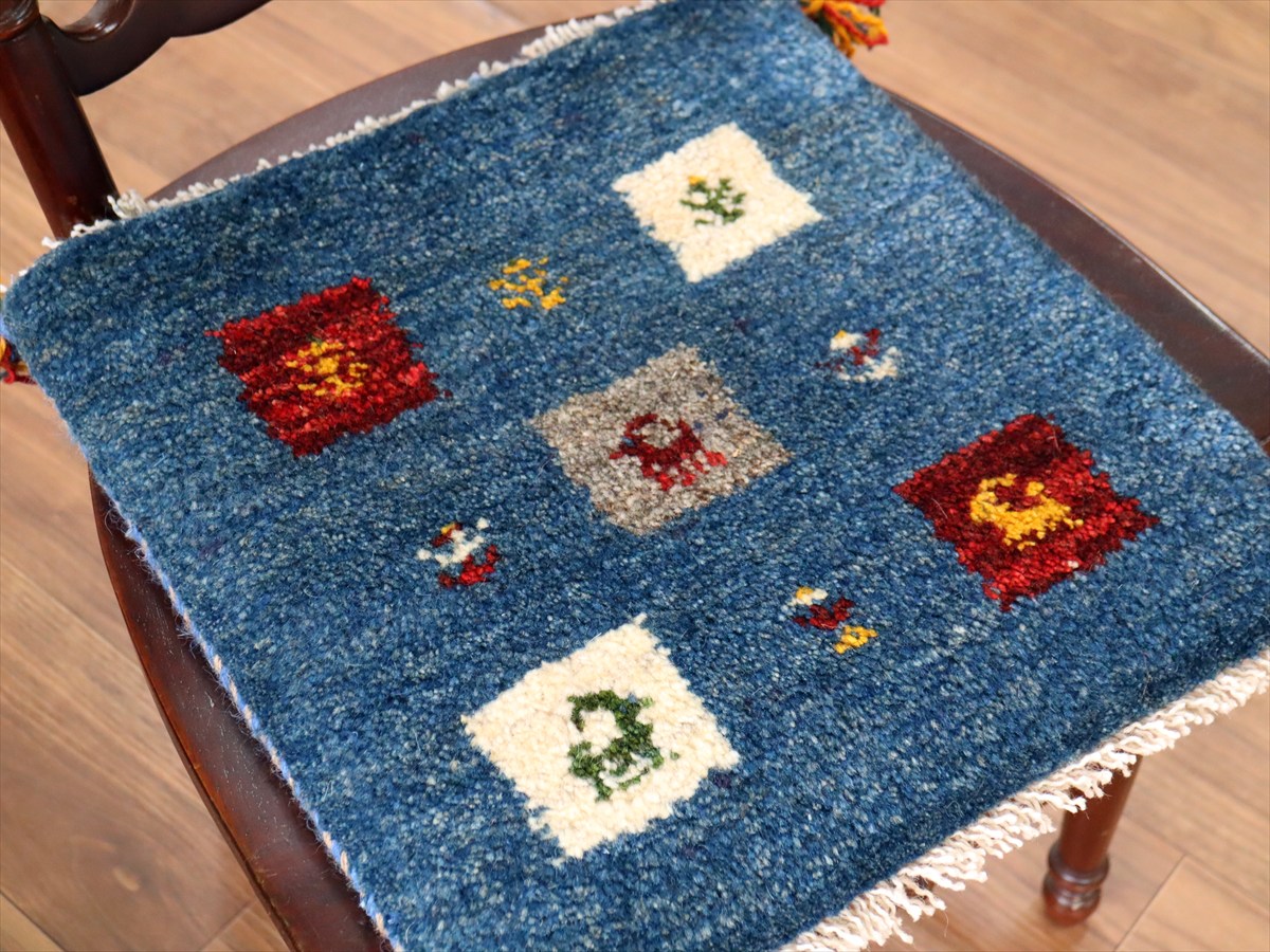 ギャッベ イラン産手織り 座布団サイズ 40×38cm ブルー カラフルタイル 動物と生命の樹