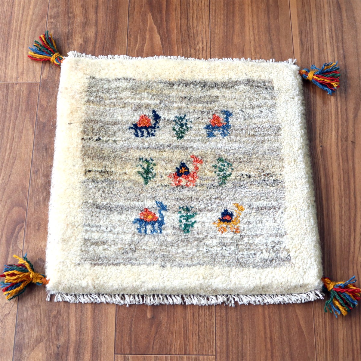 - ギャッベ イラン産手織り 座布団サイズ 41×43cm ナチュラルアイボリー ラクダと生命の樹