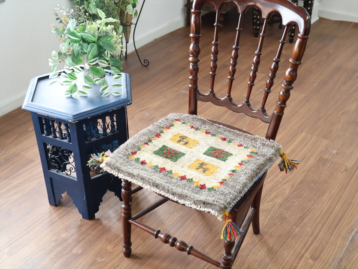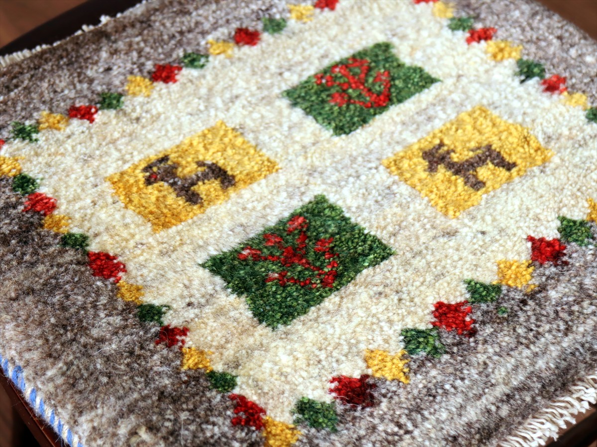 ギャッベ イラン産手織り 座布団サイズ 39×43cm ナチュラルアイボリー カラフルなタイル 動物と生命の樹