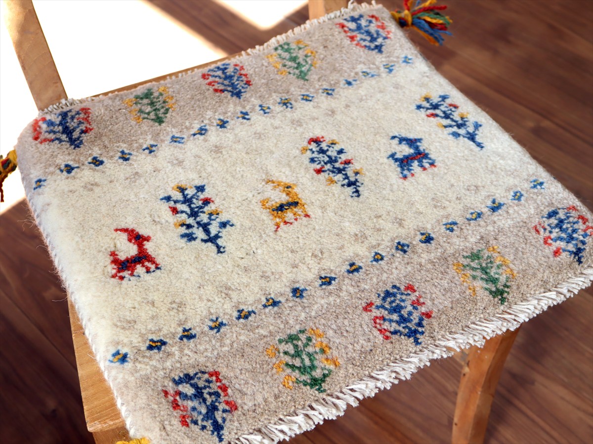 - ギャッベ イラン産手織り 座布団サイズ 39×43cm ナチュラルアイボリーカラフルな生命の樹と動物