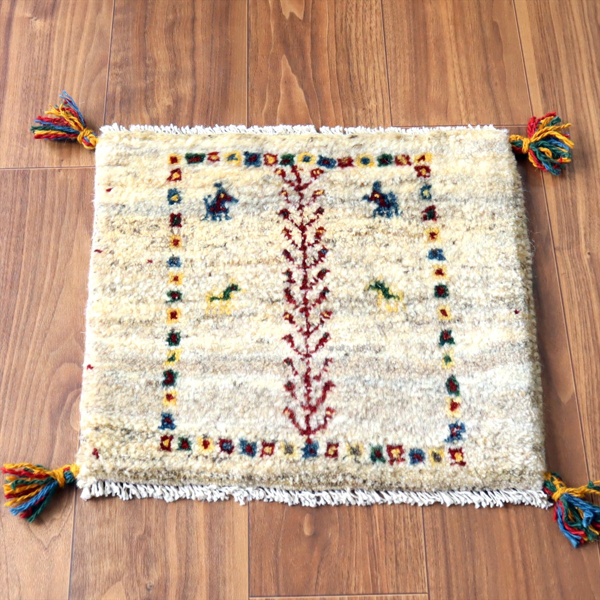 - ギャッベ イラン産手織り 座布団サイズ 40×43cm ナチュラルアイボリー 連なる生命の樹と動物