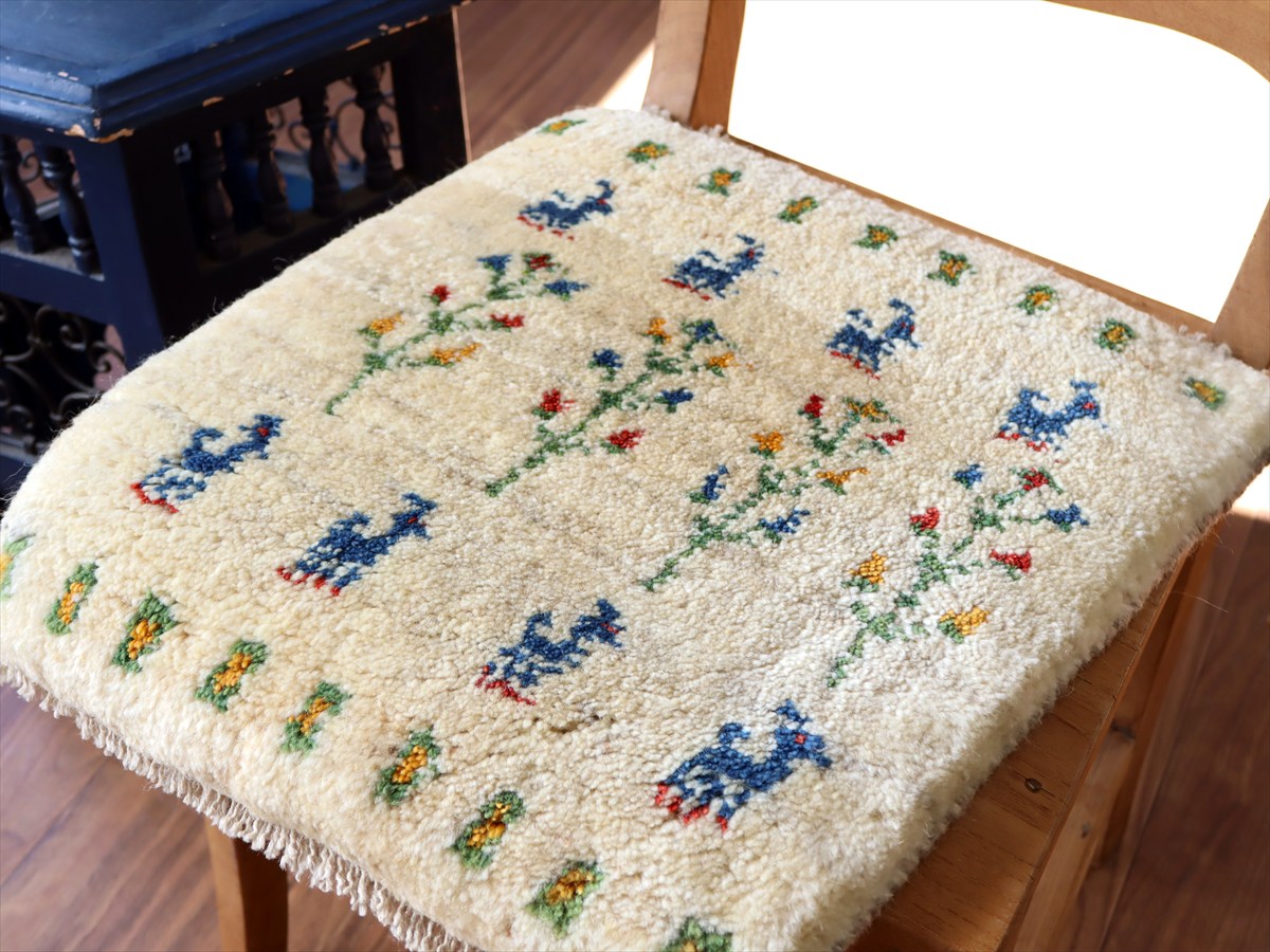 ギャッベ イラン産手織り 座布団サイズ 42×40cm ナチュラルアイボリー カラフルな生命の樹と動物
