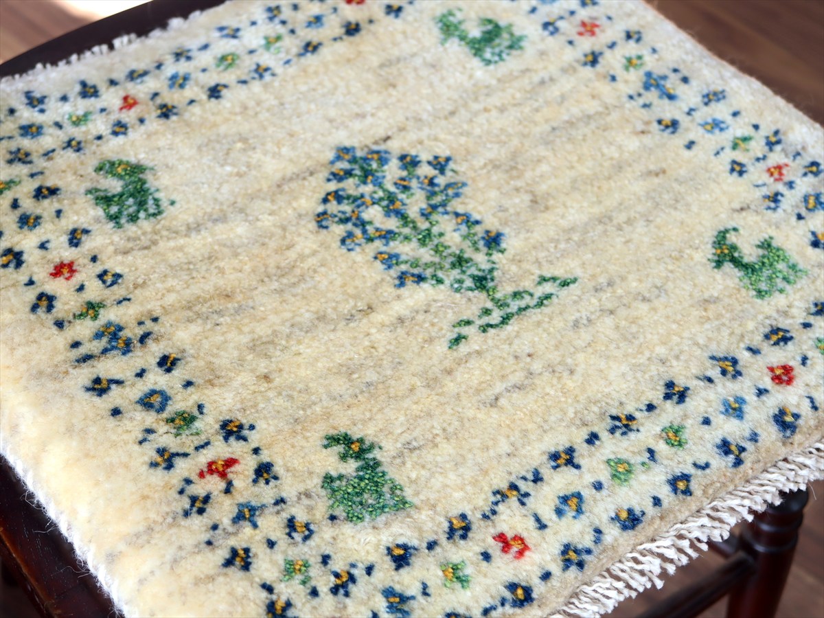 ギャッベ イラン産手織り 座布団サイズ 39×43cm ナチュラルアイボリー 生命の樹と動物