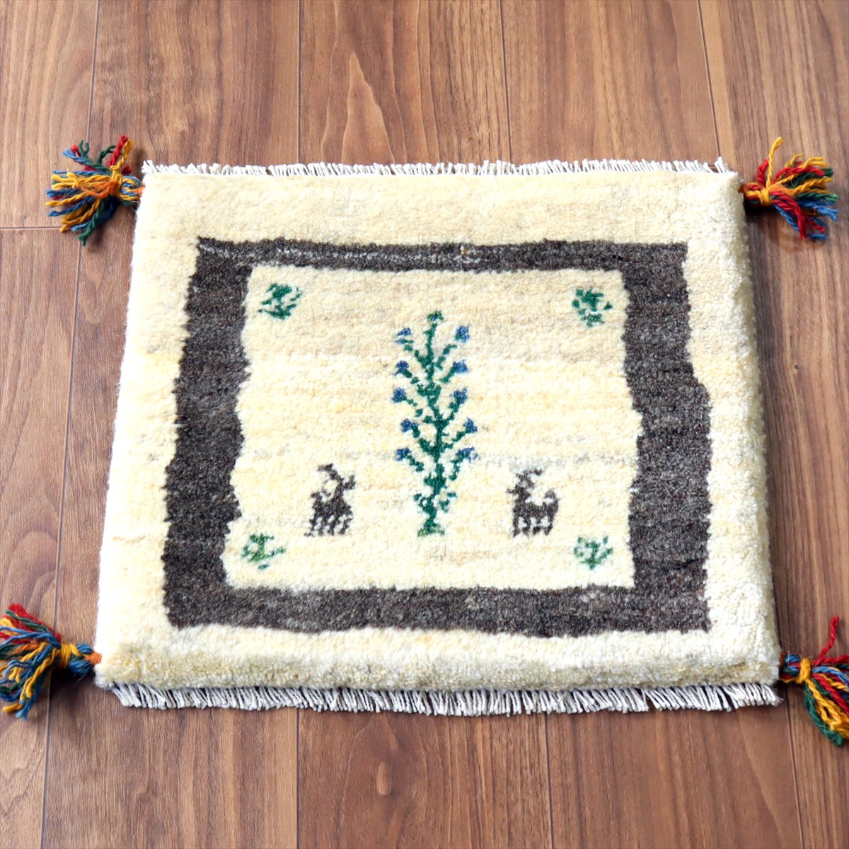 ギャッベ イラン産手織り 座布団サイズ 38×43cm ナチュラルアイボリー 生命の樹と動物