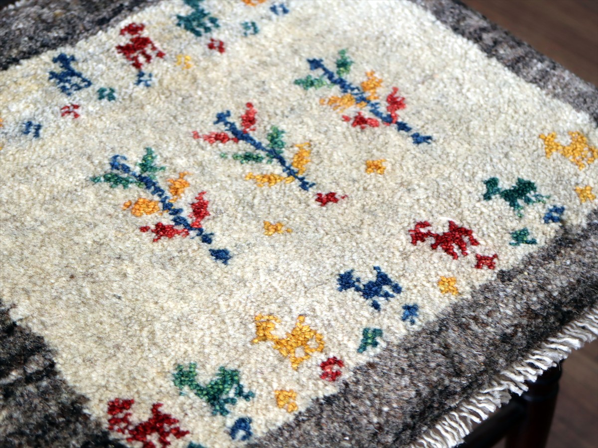 ギャッベ イラン産手織り 座布団サイズ 40×43cm ナチュラルアイボリー カラフルな生命の樹と動物