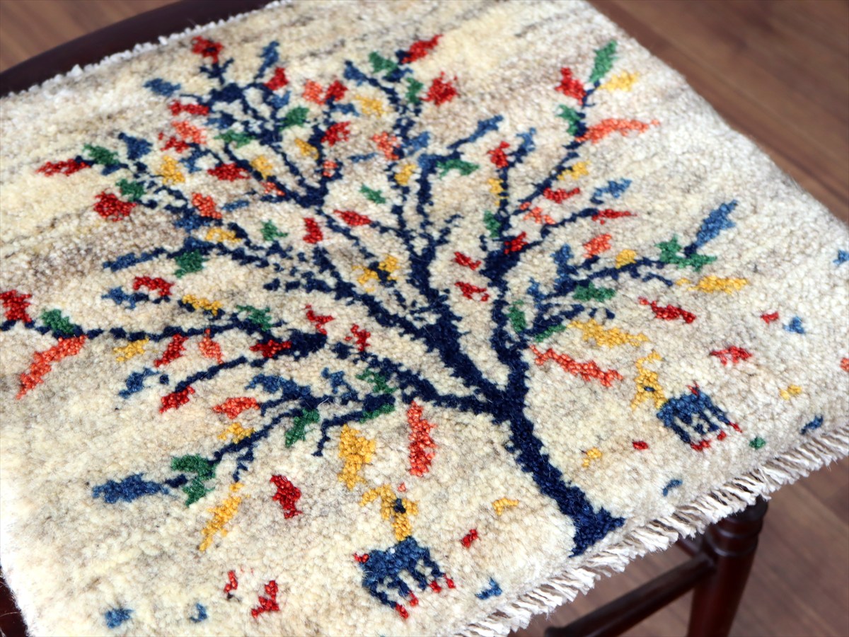 ギャッベ イラン産手織り 座布団サイズ 38×43cm ナチュラルアイボリー カラフルな花の咲いた生命の樹と動物