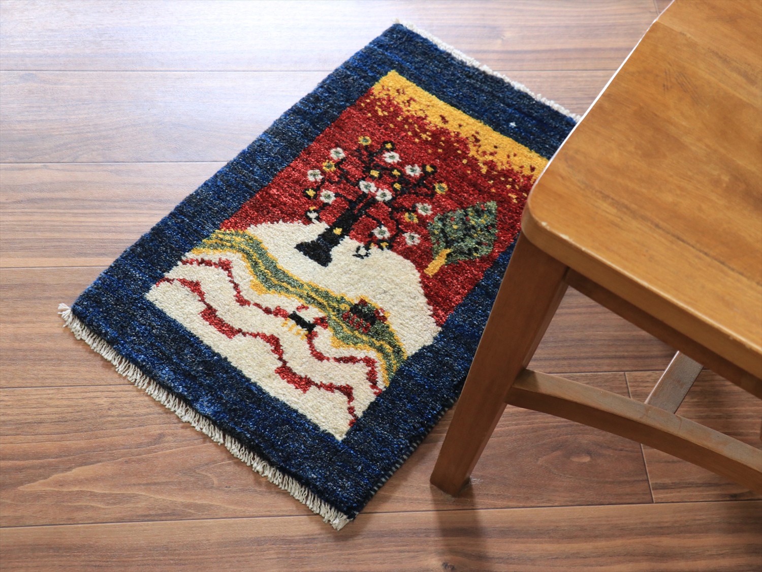 花咲く生命の木が織り込まれた風景デザインのギャッベ。花札のようですね。