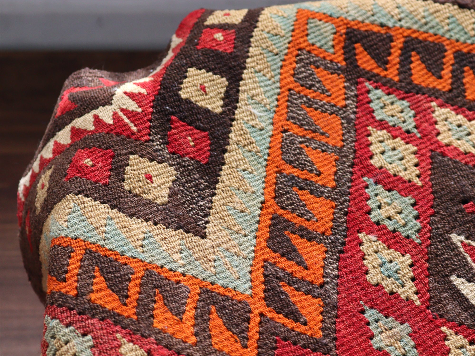 太い糸を使い、ざっくりとワイルドに織られています。織り地はぽてっとした厚みがあります。ターコイズの色糸は日焼けしているようで、裏面と見比べると色褪せているのがわかります。