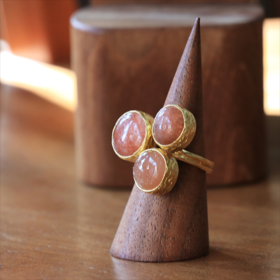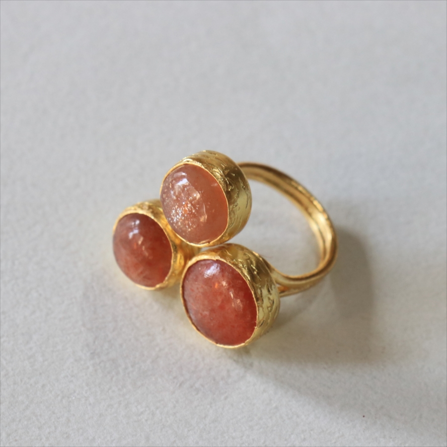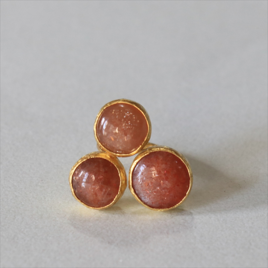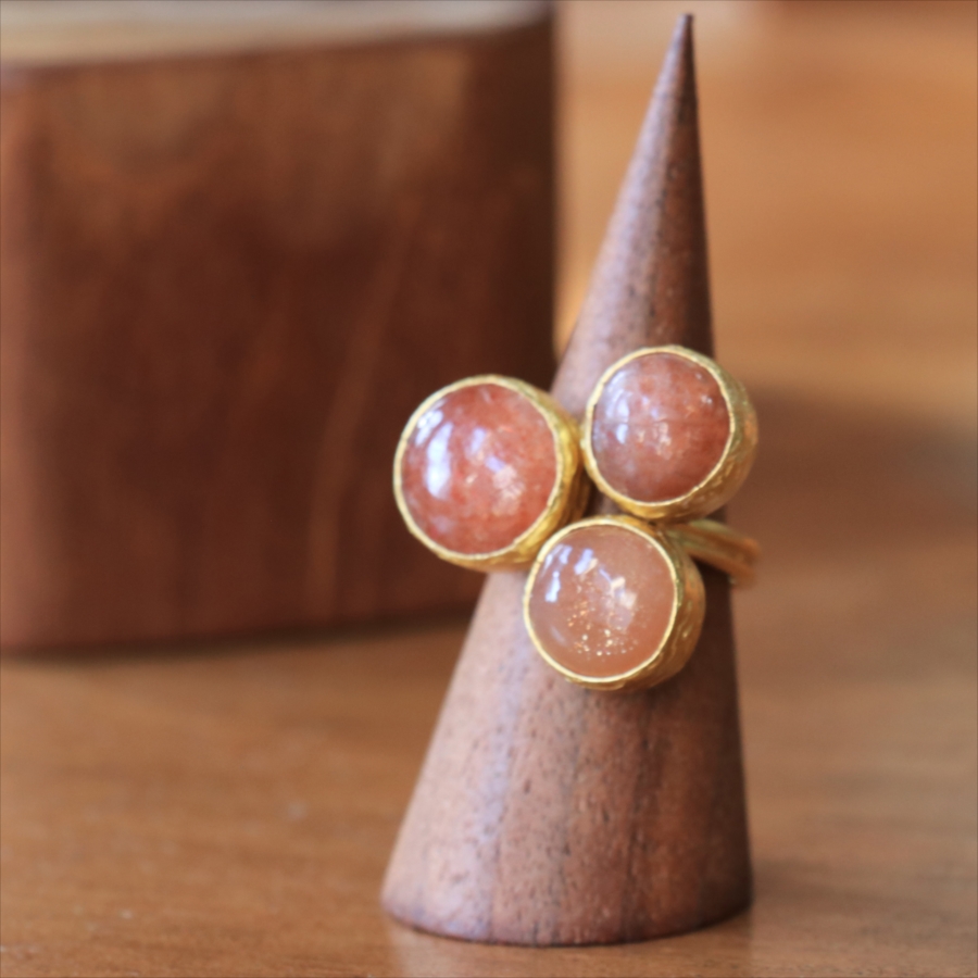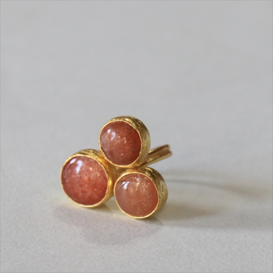 ほんのりブラウンがかったレンガの石の中に、よく見るときらきらと輝くインクルージョンがちりばめられたサンストーンが三つ並んだリング。コロンと丸形の3つの石はそれぞれ個性があり、ラメの様な輝きが光の射す角度によってきらめきます。