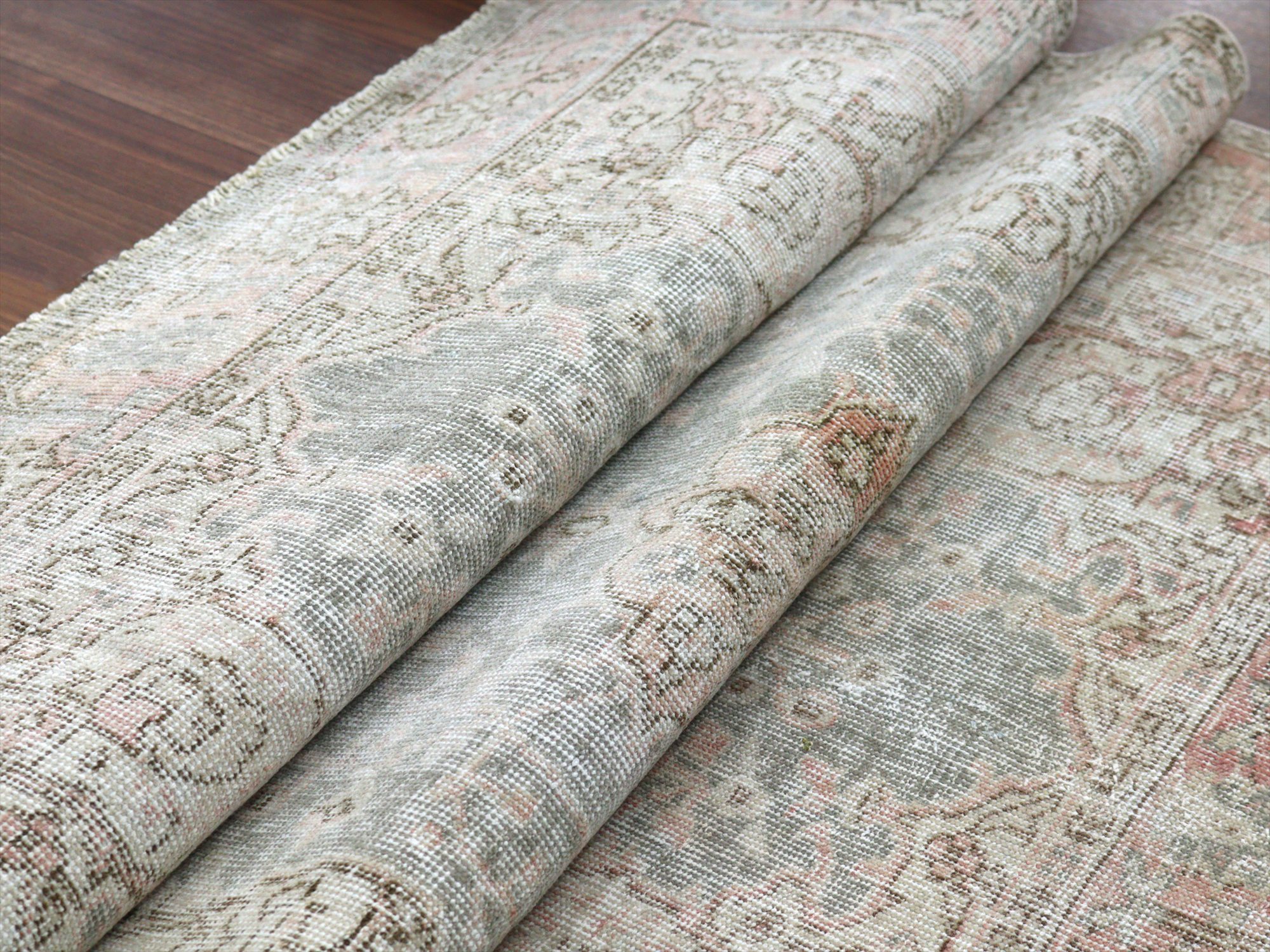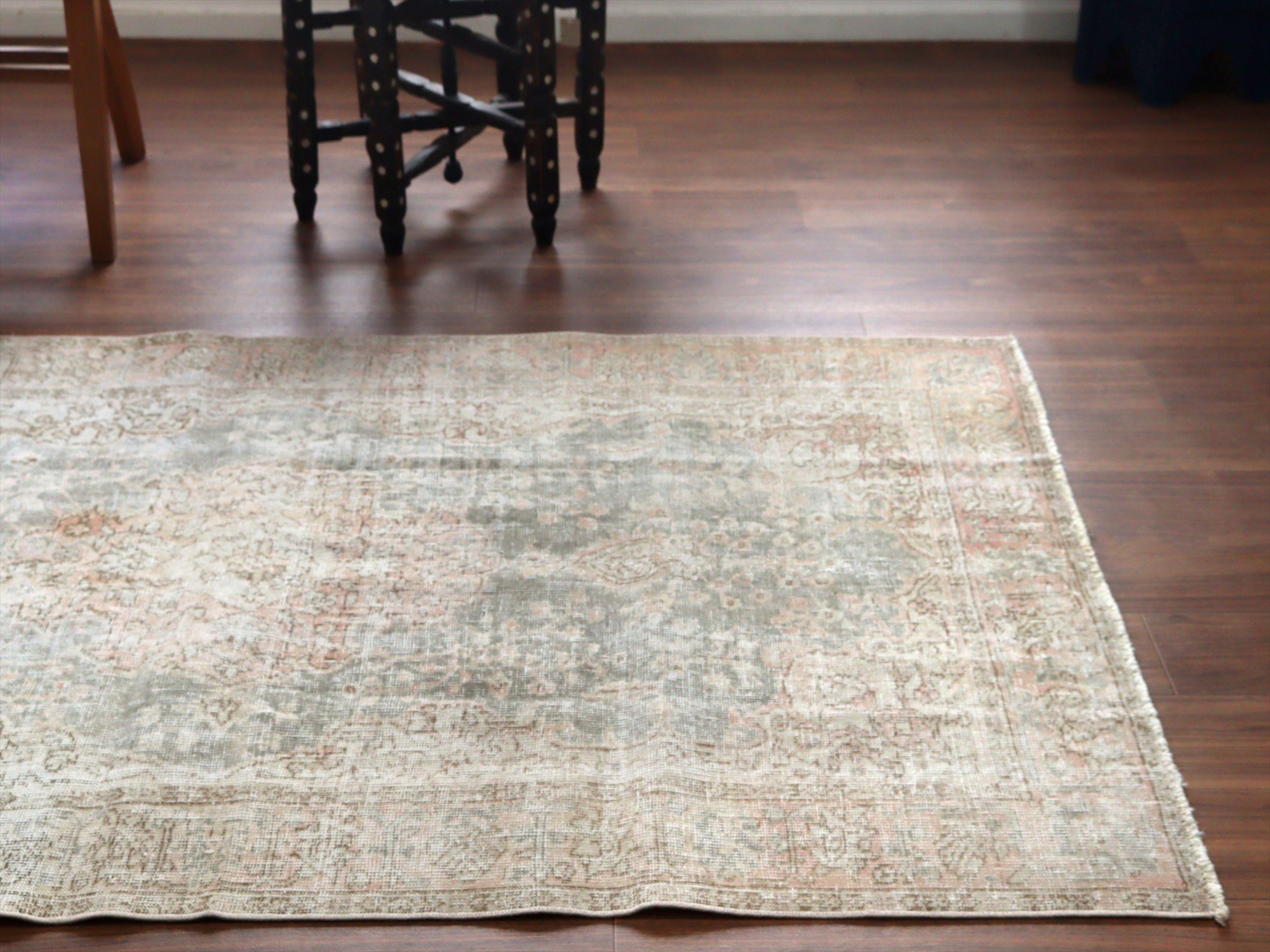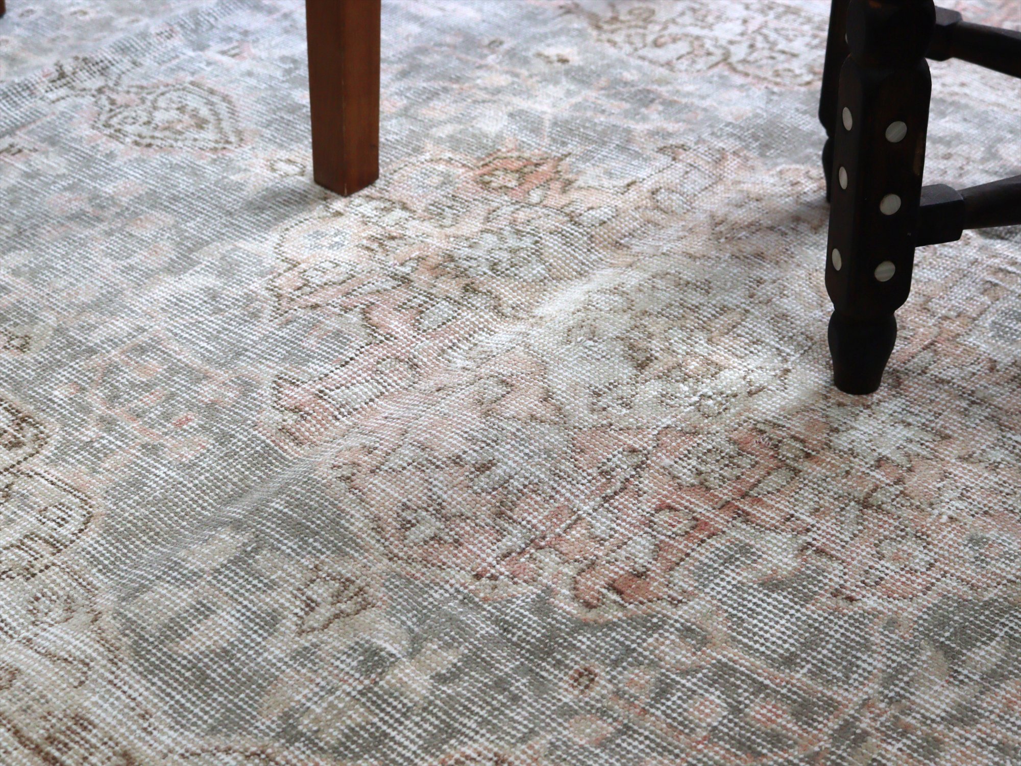 ダメージが多く、使われなくなった古い手織りカーペットを、洗った上でブリーチをかけてあります。色褪せた中にもオリジナルのデザインが薄く見えて、ヴィンテージ感のある仕上がりです。