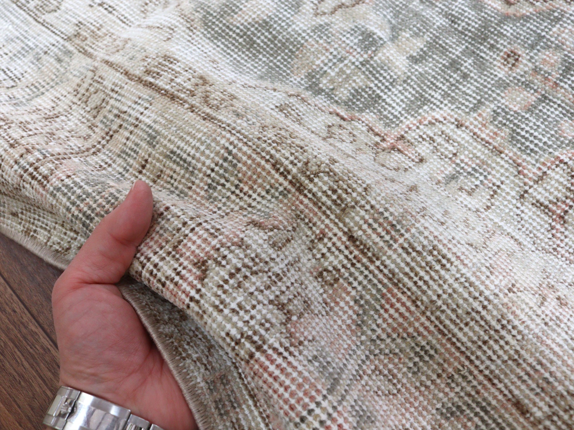 もともとユーズドラグをリサイクルしていますので、全体的に古びた印象に加工してあります。じゅうたん自体はしっかりしていますので、まだまだこれからもお使いいただけます。ベースを含めたラグの厚みは5-6mm前後で、全体的にパイル(毛足)は短く、結び目が見えています。このラグはブリーチのみで、上から別の色に染めてはいないようです。