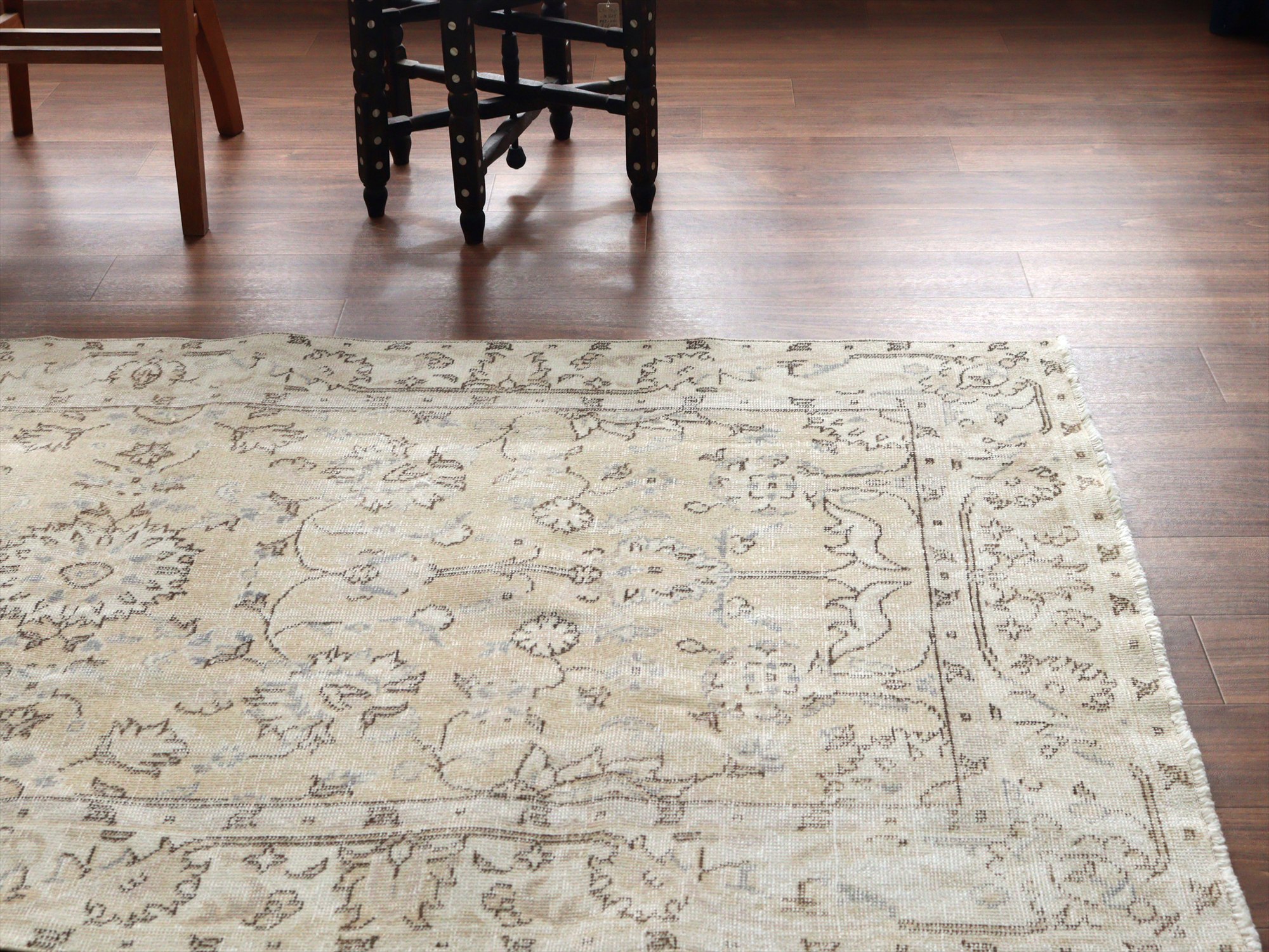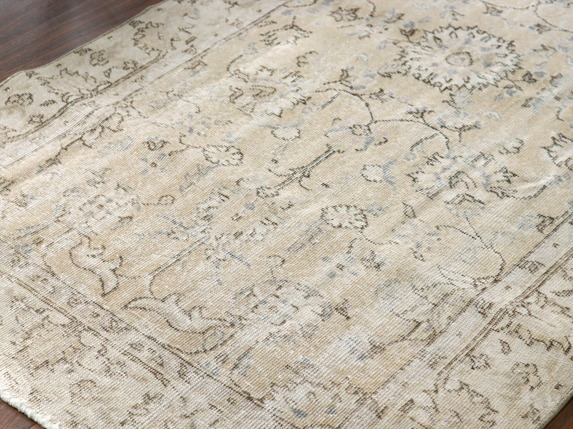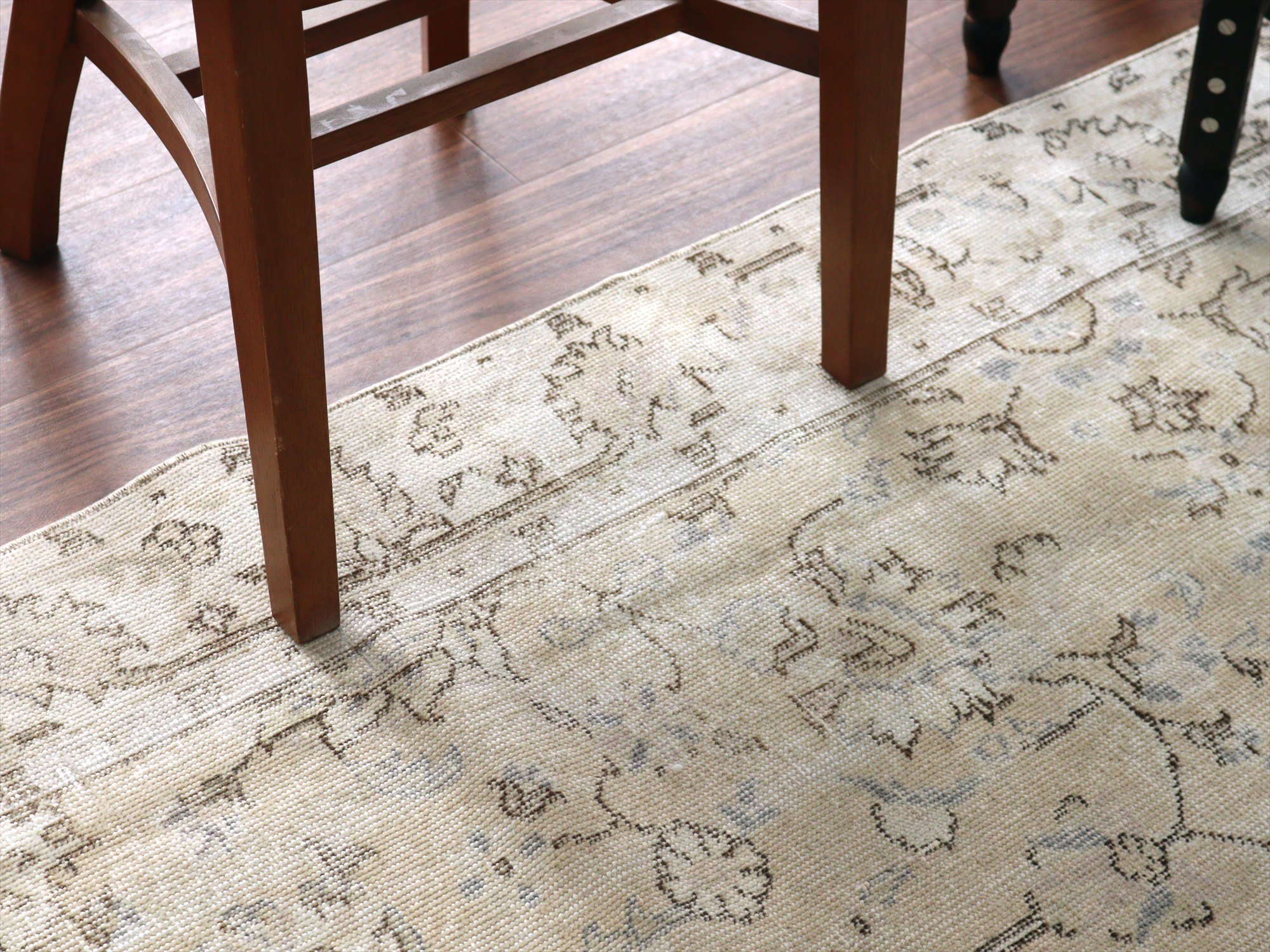 ダメージが多く、使われなくなった古い手織りカーペットを、洗った上でブリーチをかけてあります。色褪せた中にもオリジナルのデザインが薄く見えて、ヴィンテージ感のある仕上がりです。