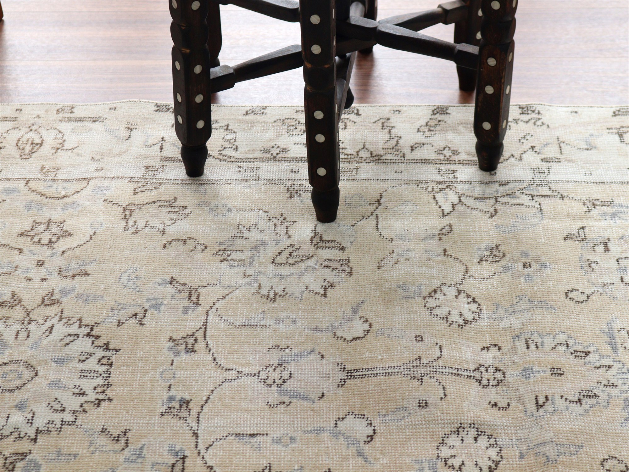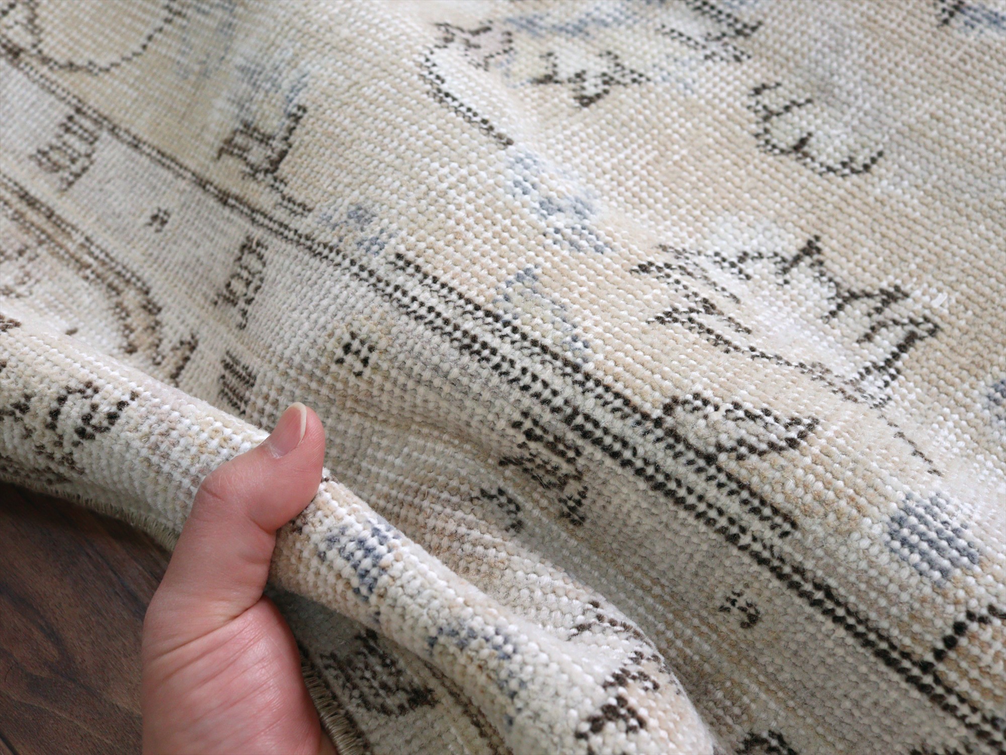 もともとユーズドラグをリサイクルしていますので、全体的に古びた印象に加工してあります。じゅうたん自体はしっかりしていますので、まだまだこれからもお使いいただけます。ベースを含めたラグの厚みは5-6mm前後で、全体的にパイル(毛足)は短く、結び目が見えています。このラグはブリーチのみで、上から別の色に染めてはいないようです。