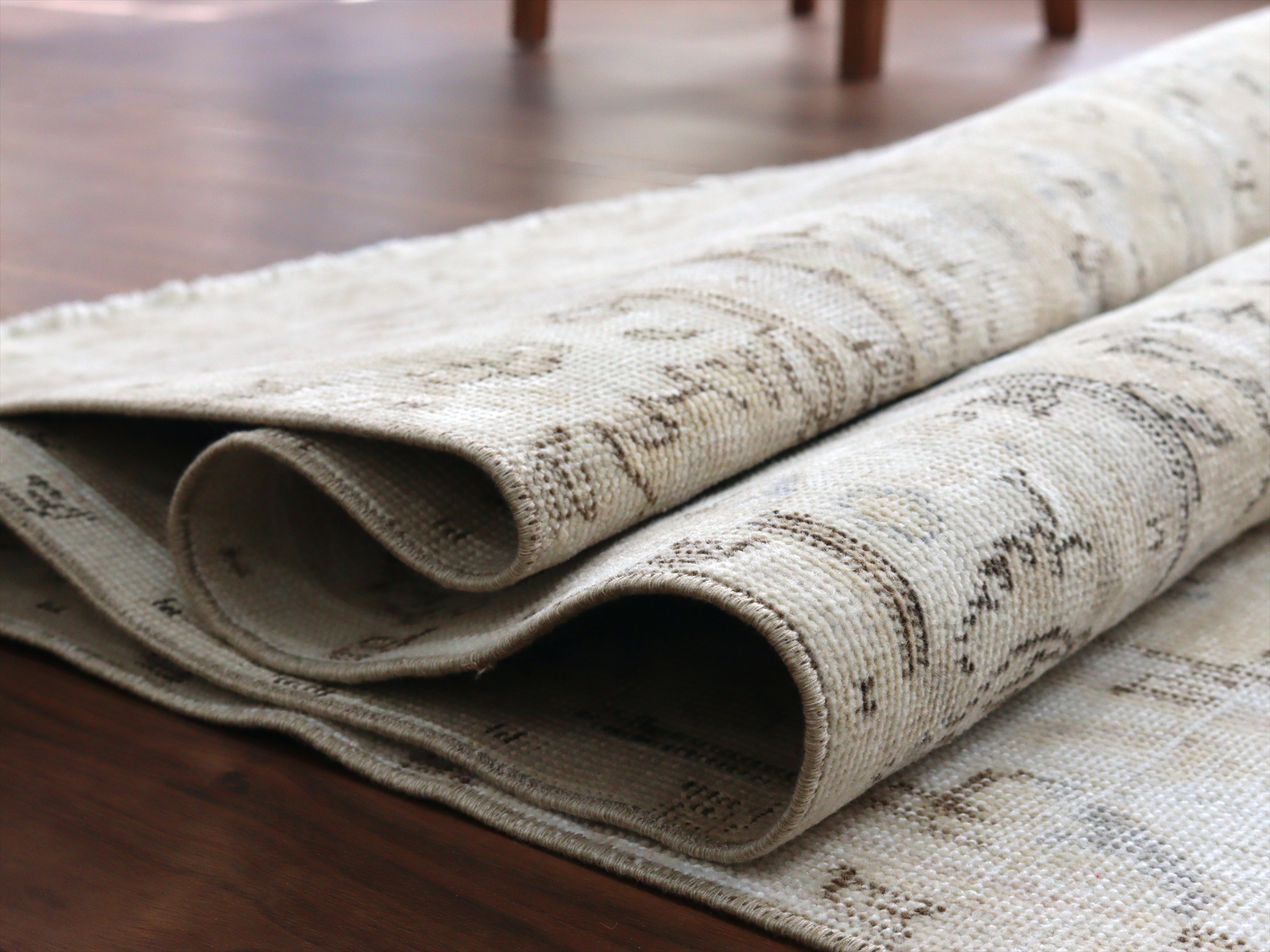 長い間使われて、パイルのすり減りなどダメージのあるラグを、リサイクルするためにクリーニング、ブリーチ加工したアップルサイクルの手織りラグです。ダメージ部分も、年代を経たラグならではの味わいととらえています。