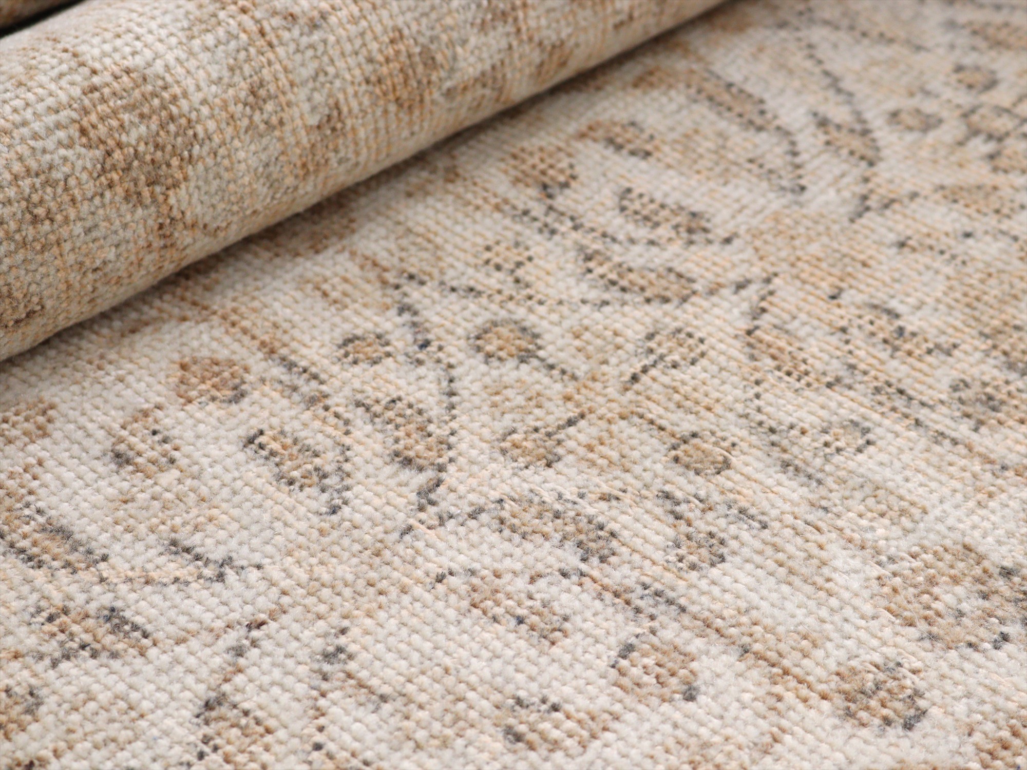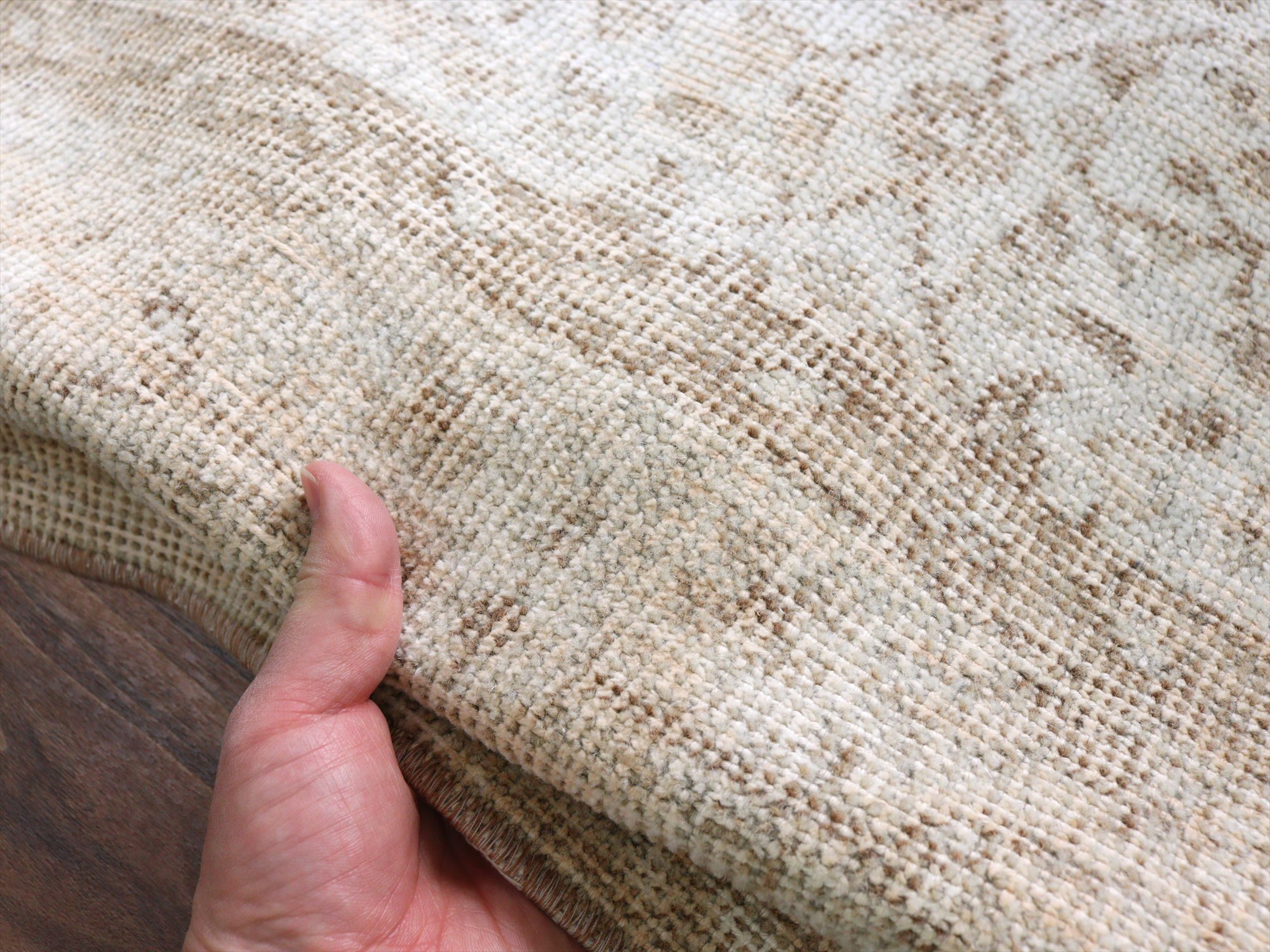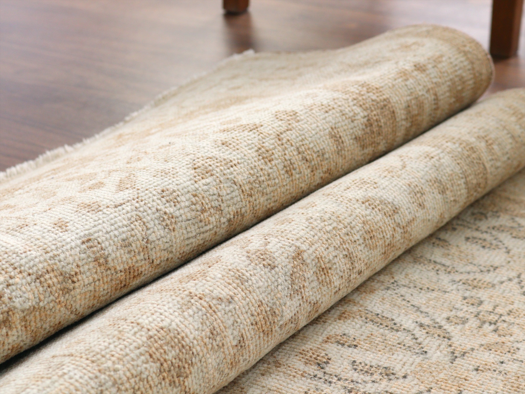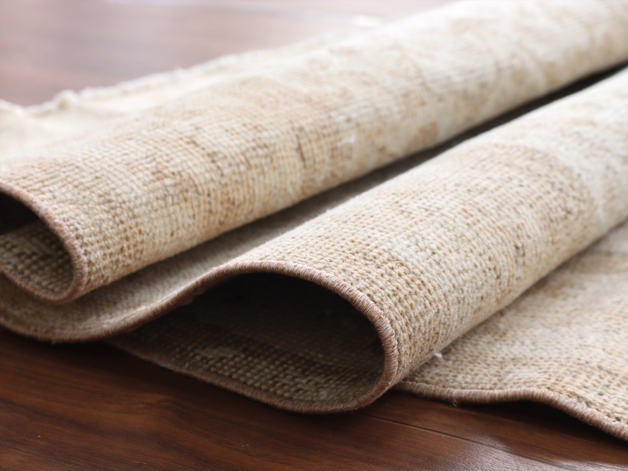 もともとユーズドラグをリサイクルしていますので、全体的に古びた印象に加工してあります。じゅうたん自体はしっかりしていますので、まだまだこれからもお使いいただけます。ベースを含めたラグの厚みは5-6mm前後で、全体的にパイル(毛足)は短く、結び目が見えています。このラグはブリーチのみで、上から別の色に染めてはいないようです。
