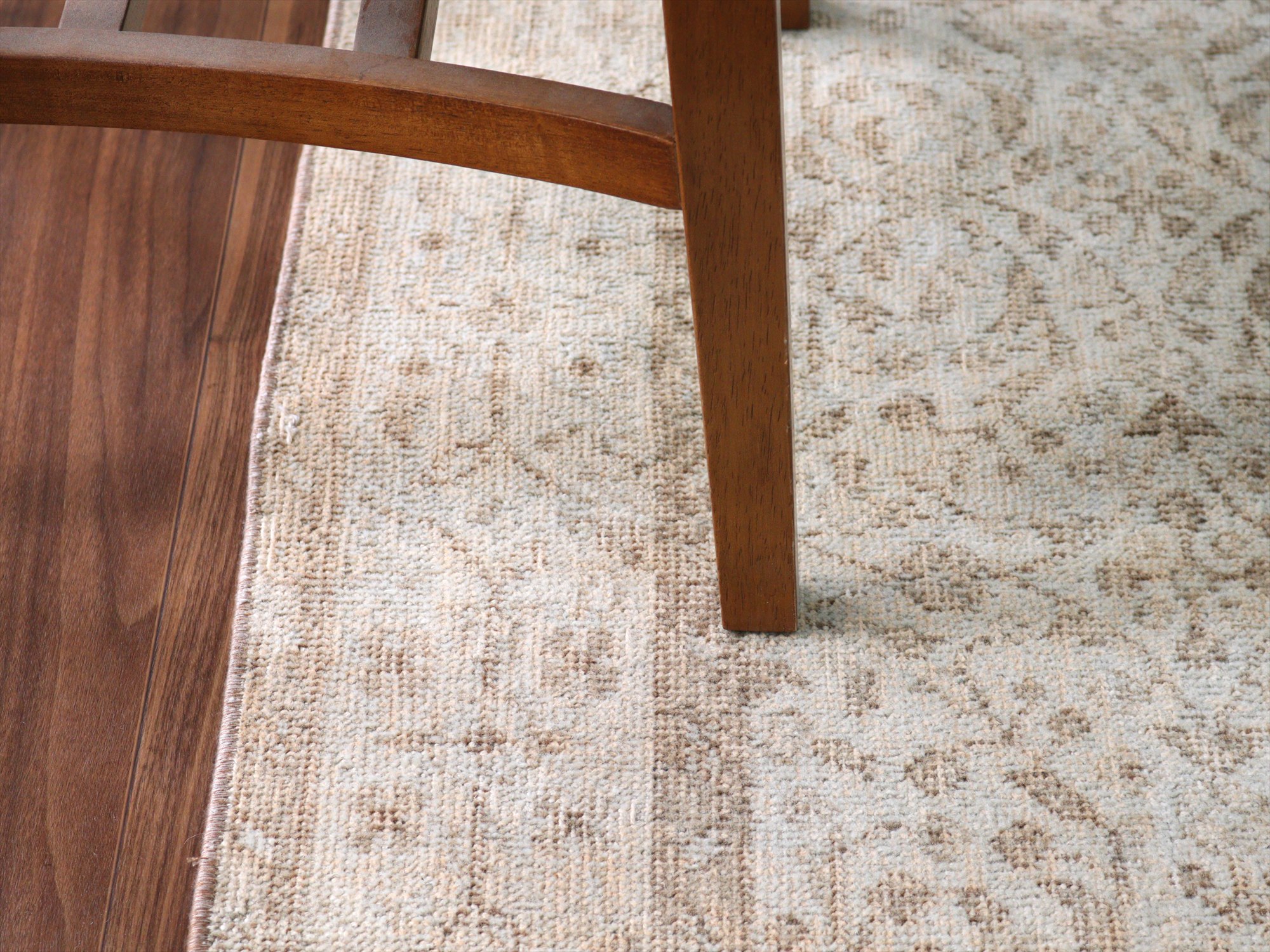 長い間使われて、パイルのすり減りなどダメージのあるラグを、リサイクルするためにクリーニング、ブリーチ加工したアップルサイクルの手織りラグです。ダメージ部分も、年代を経たラグならではの味わいととらえています。