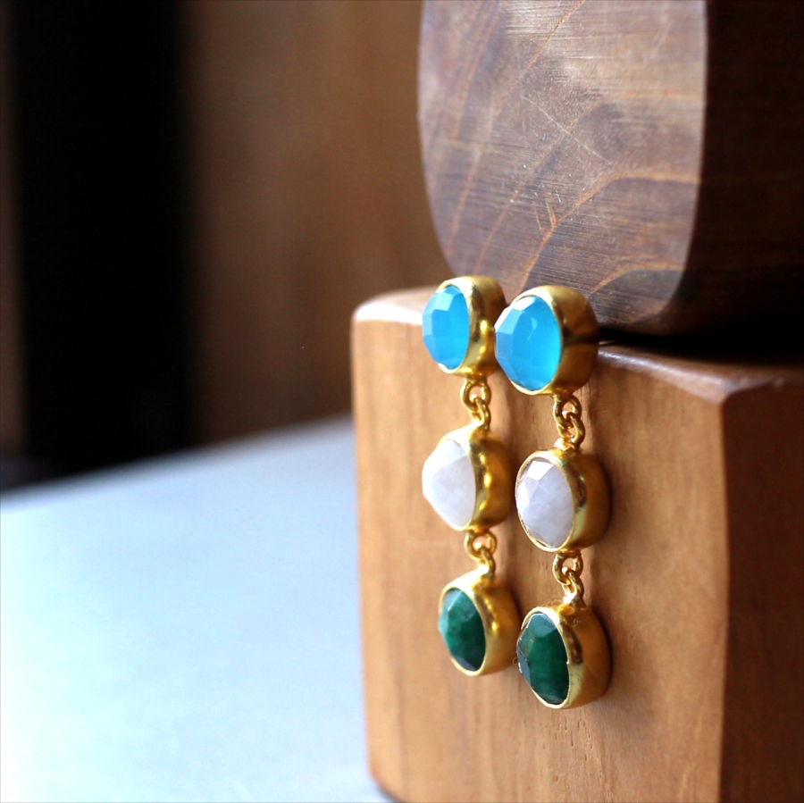 ブルーカルセドニー、ホワイトカルセドニー、エメラルド、異なる3色の天然石を縦に連ねたデザインは、動くたびに上品な揺れ感を生み、顔まわりを華やかに演出します。