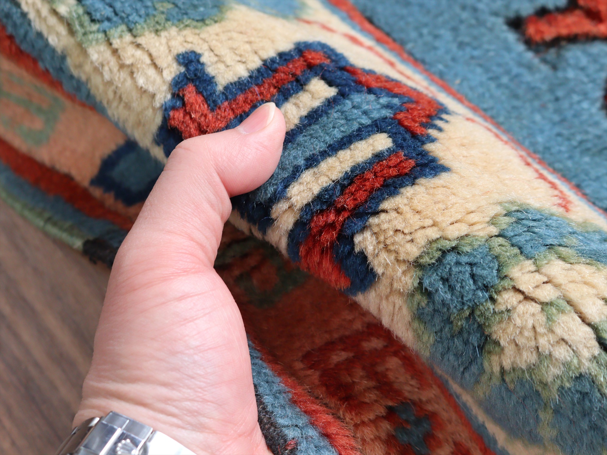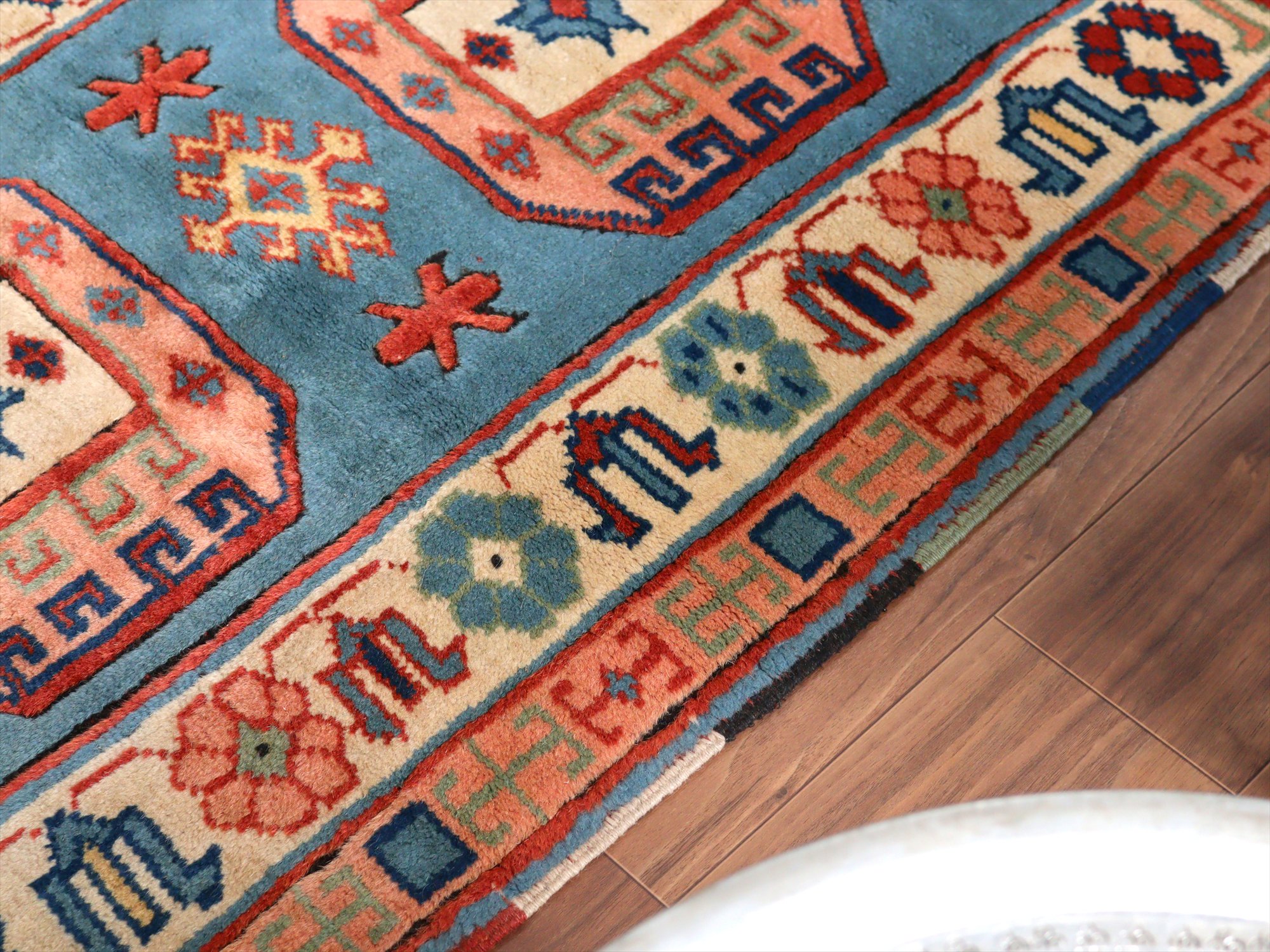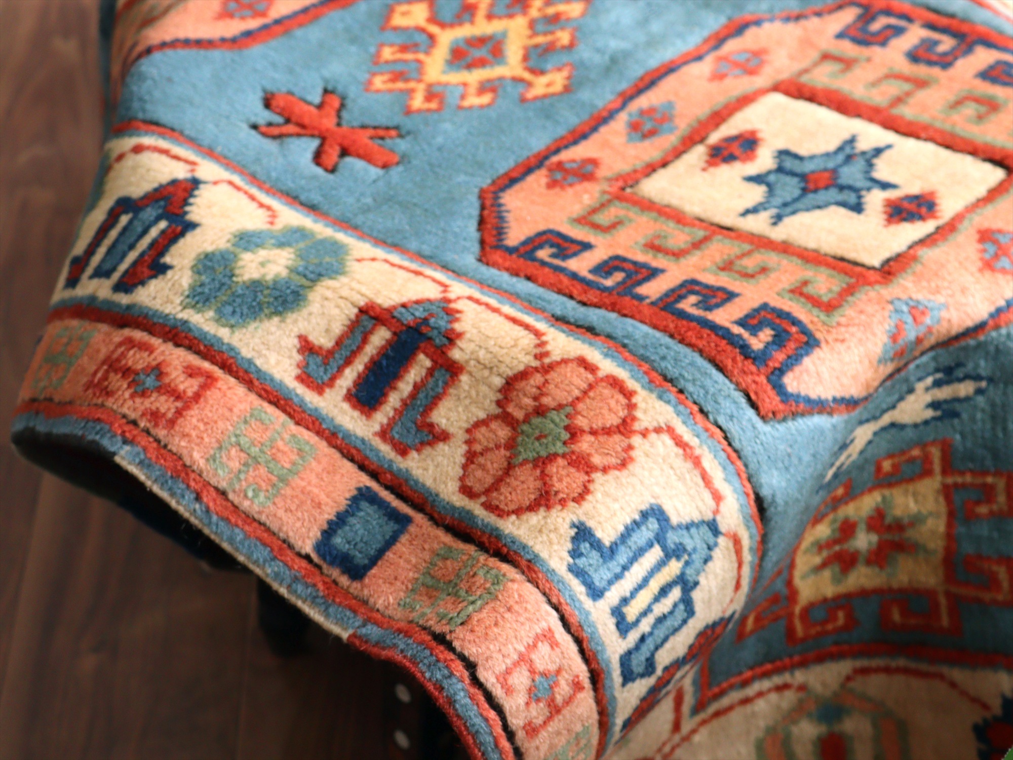 トルコの北西部に位置する港町、チャナッカレで織られた絨毯。大柄のモチーフ、またピンクがかった朱色、ブルー、グリーン、水色など明るい色使いで全体的にかわいらしい印象です。横幅が抑えられていて、やや細長いサイズ感で、アクセント使いにもちょうど良さそうです。