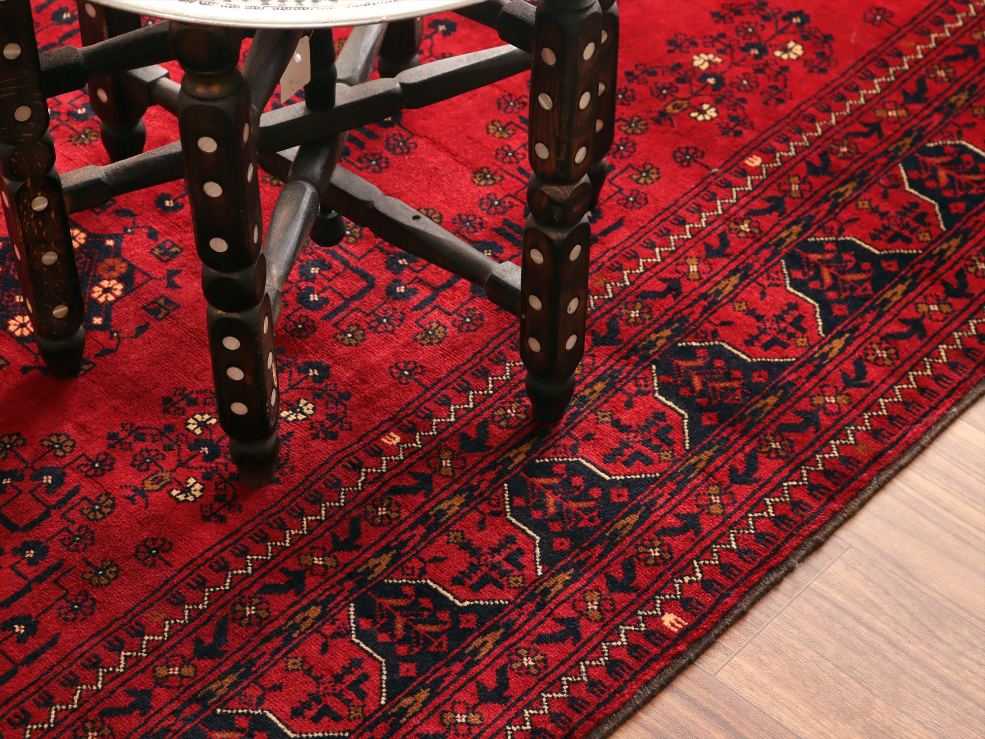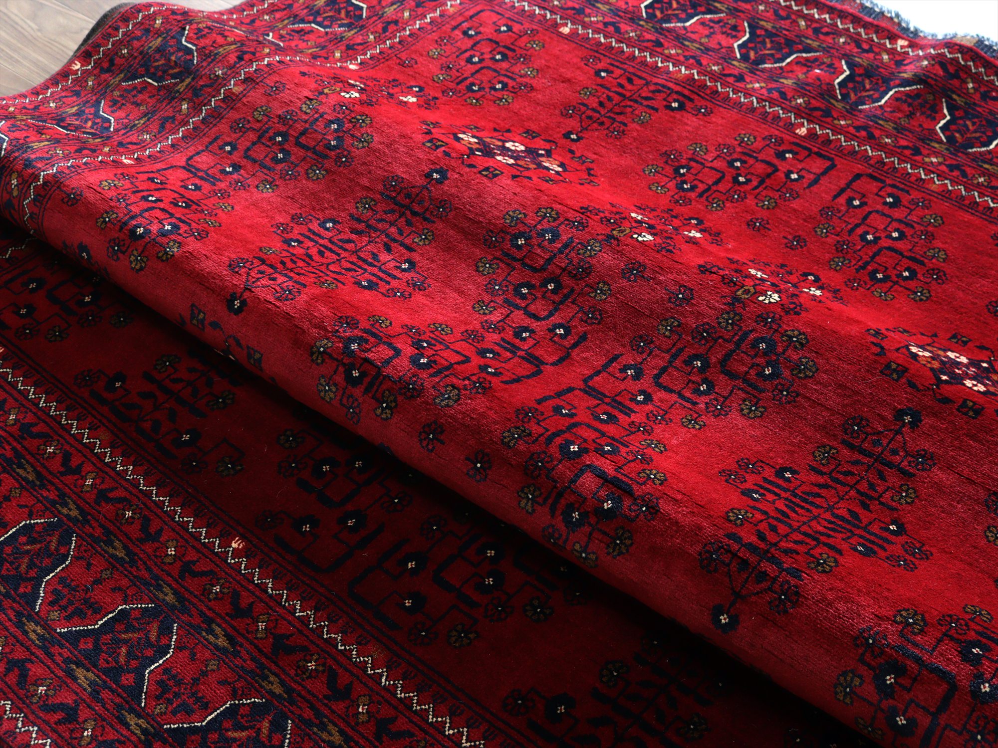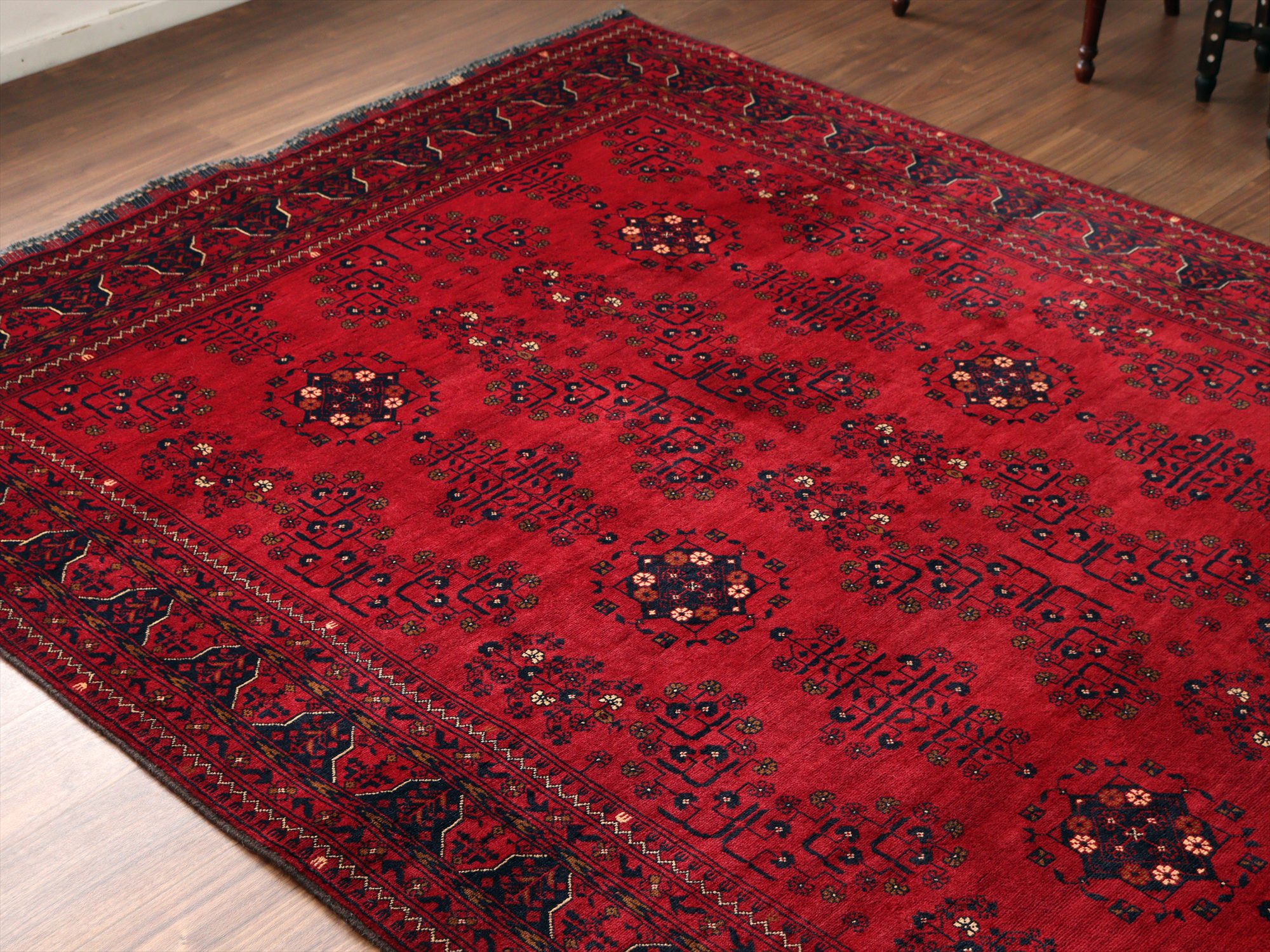 深い赤がどっしりとした重厚感を演出するアフガニスタン北部のクンドゥズ地方で織られた高級絨毯です。モチーフが細かいところまできれいに表現されていて、まさに洗練された1枚と言えるでしょう。