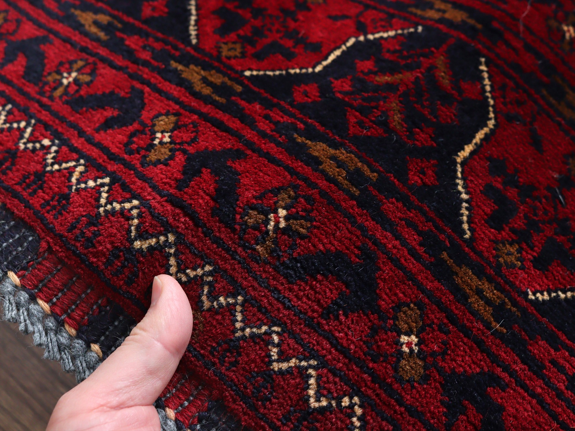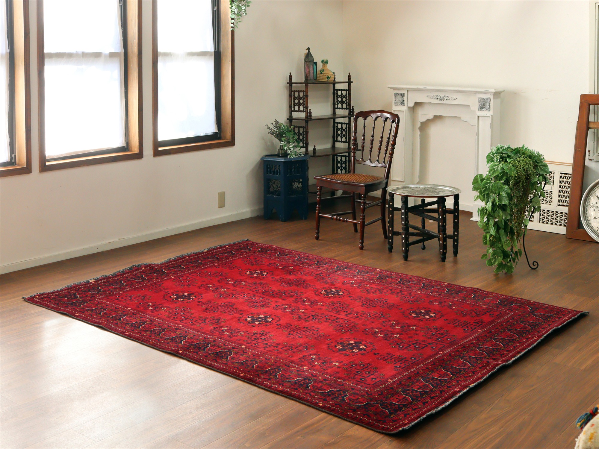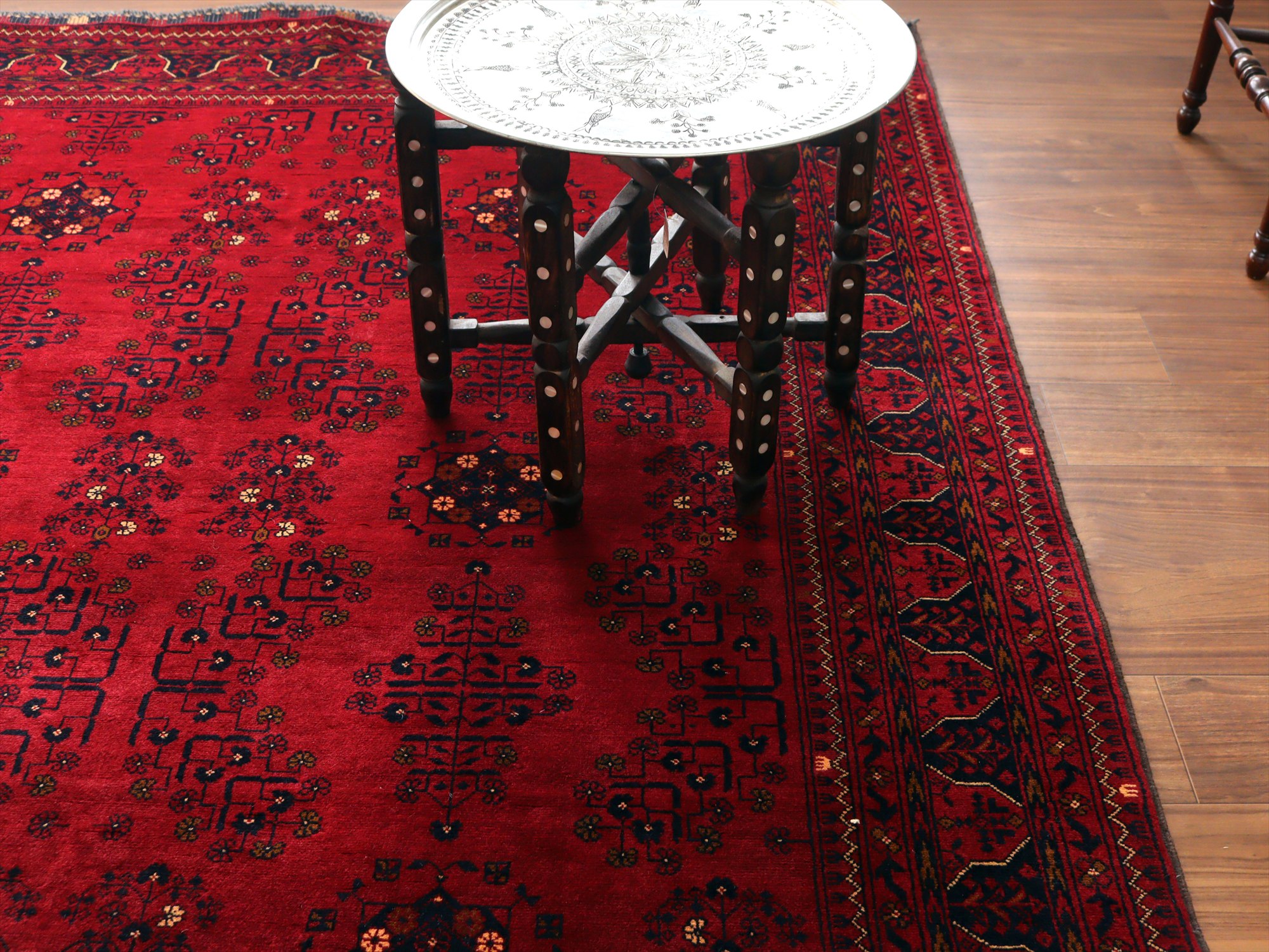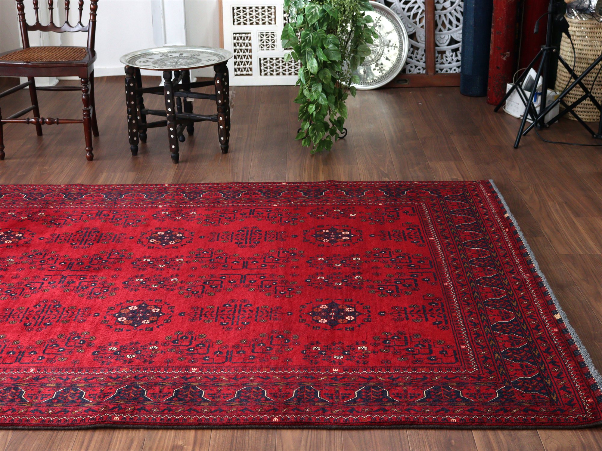 深い赤がどっしりとした重厚感を演出するアフガニスタン北部のクンドゥズ地方で織られた高級絨毯です。モチーフが細かいところまできれいに表現されていて、まさに洗練された1枚と言えるでしょう。