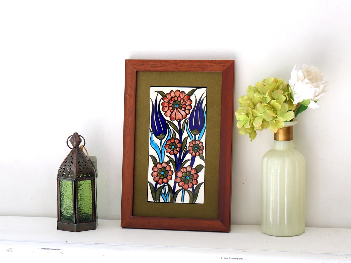 手書きタイル トルコ陶器 ミニタイル1枚額 H29×W19×D1.5cm チューリップ&カーネーション Turkish Hand Paint Tile
