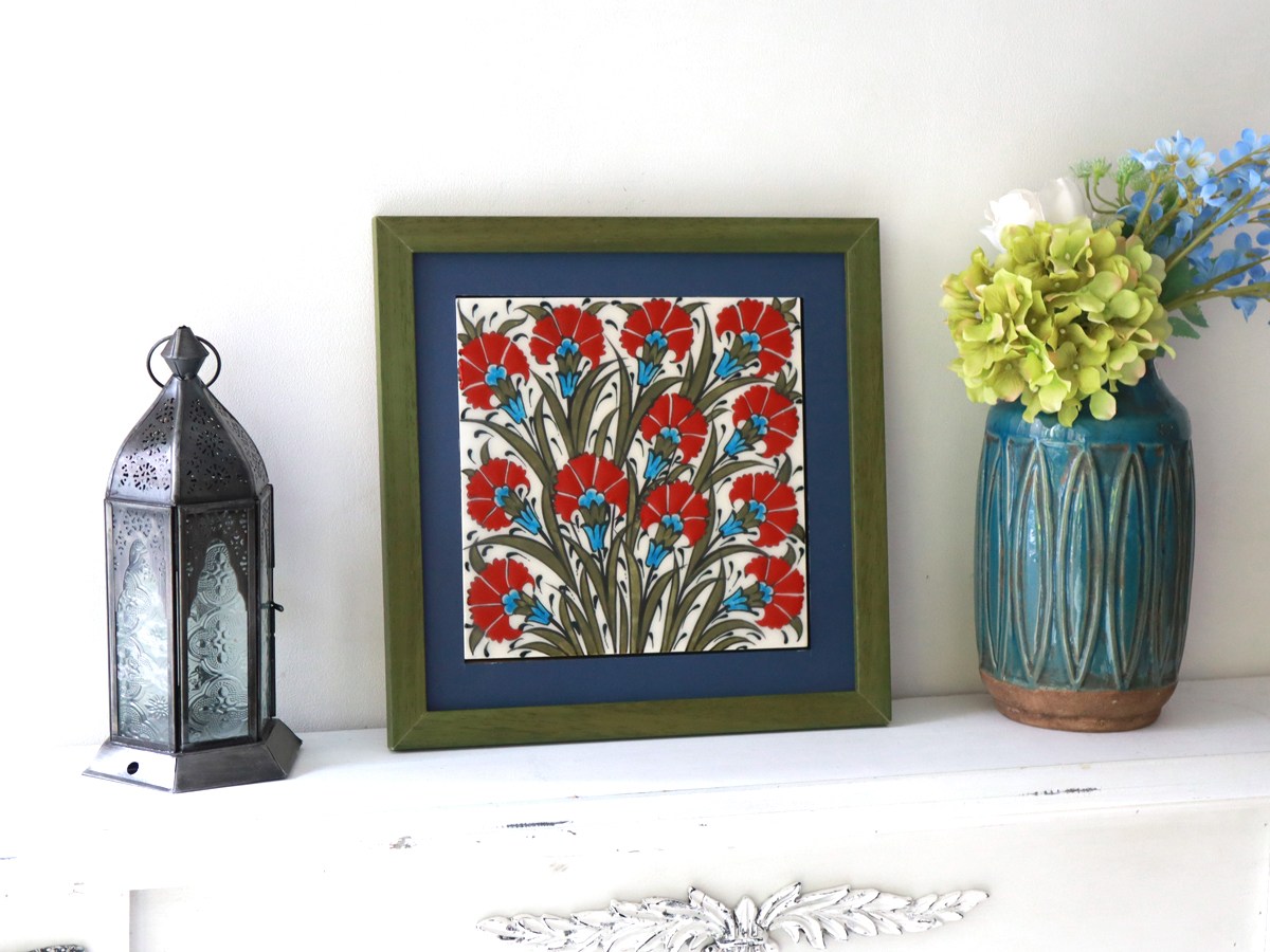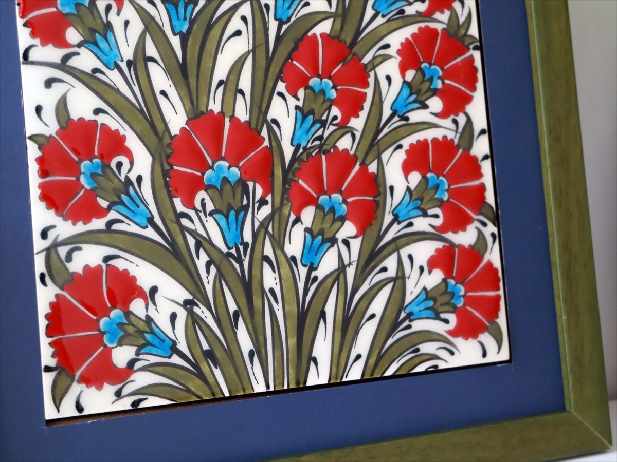 トルコ陶器 手書きタイル 1枚額 H29×W29×D1.5cm カーネーション Turkish Hand Paint Tile