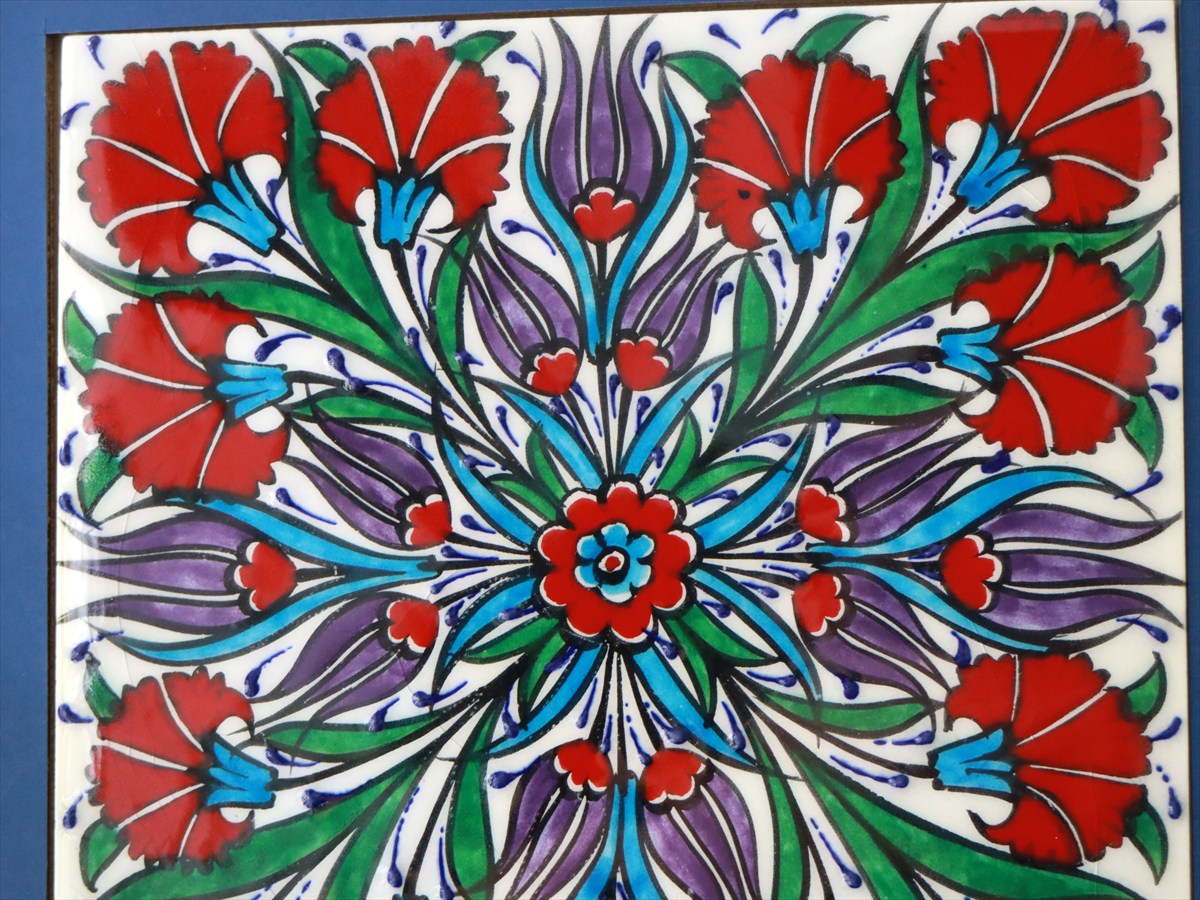 トルコ陶器 手書きタイル 1枚額 H29×W29×D1.5cm チューリップ&カーネーション Turkish Hand Paint Tile