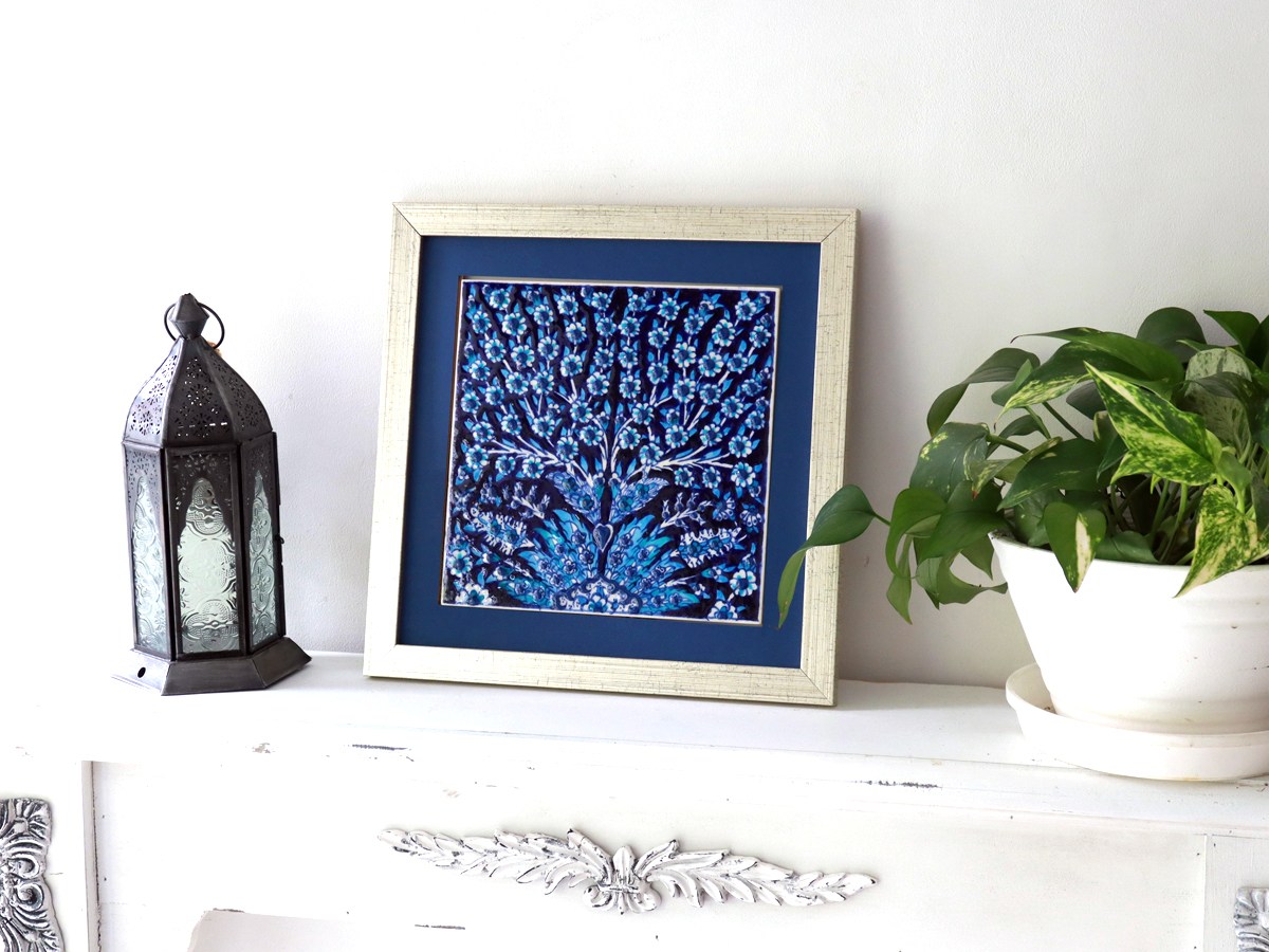 トルコ陶器 手書きタイル 1枚額 H29×W29×D1.5cm プラムツリー・ブルー Turkish Hand Paint Tile