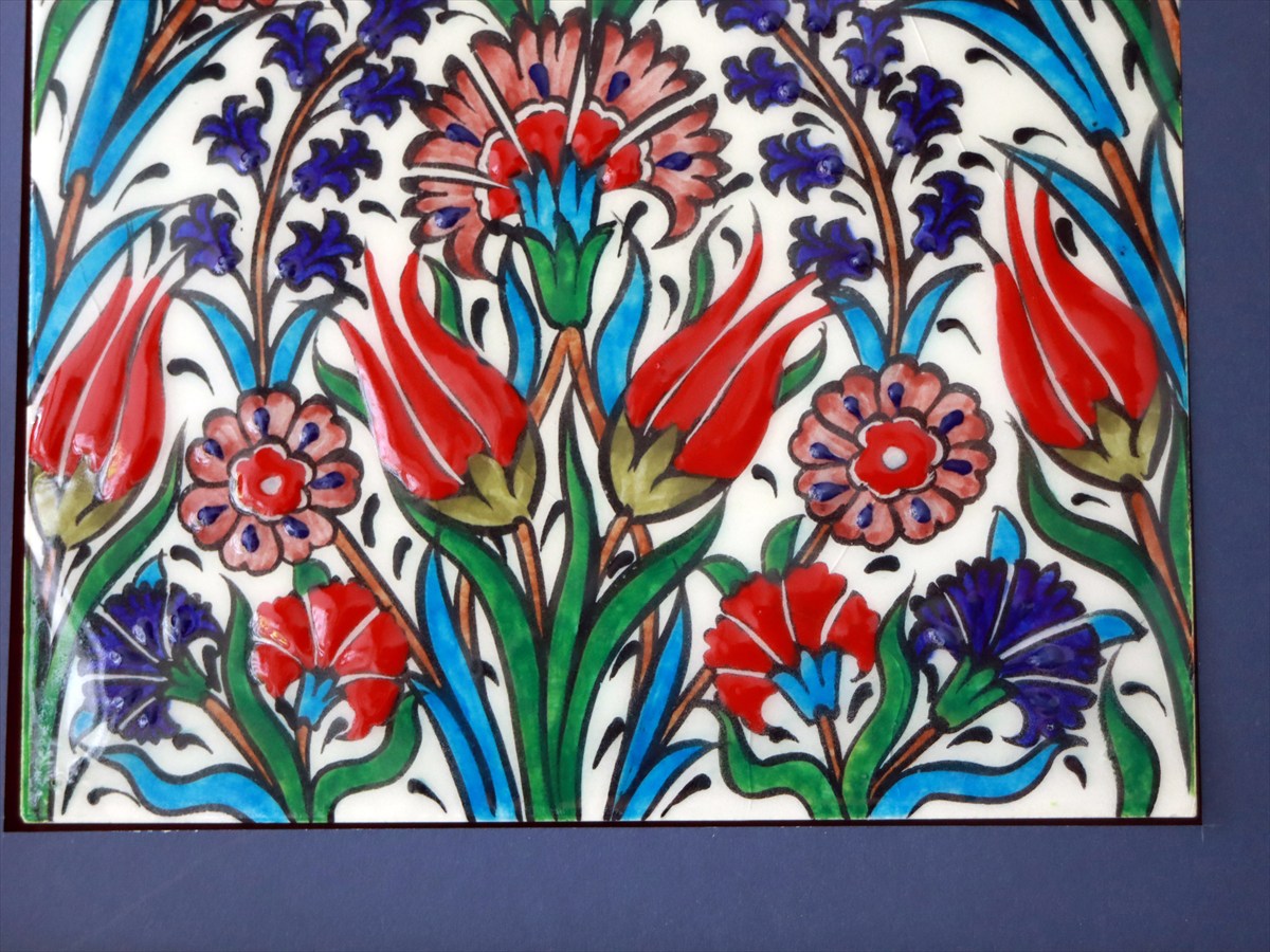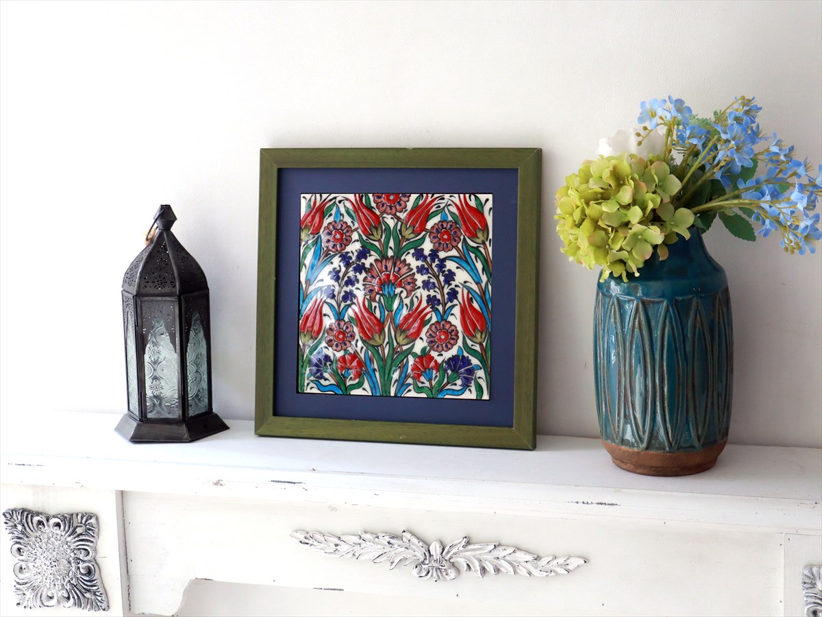 トルコ陶器 手書きタイル 1枚額 H29×W29×D1.5cm チューリップ&カーネーション Turkish Hand Paint Tile