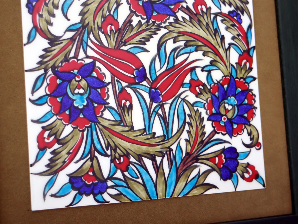 トルコ陶器 手書きタイル 1枚額 H32×W32×D1.5cm チューリップ&カーネーション Turkish Hand Paint Tile