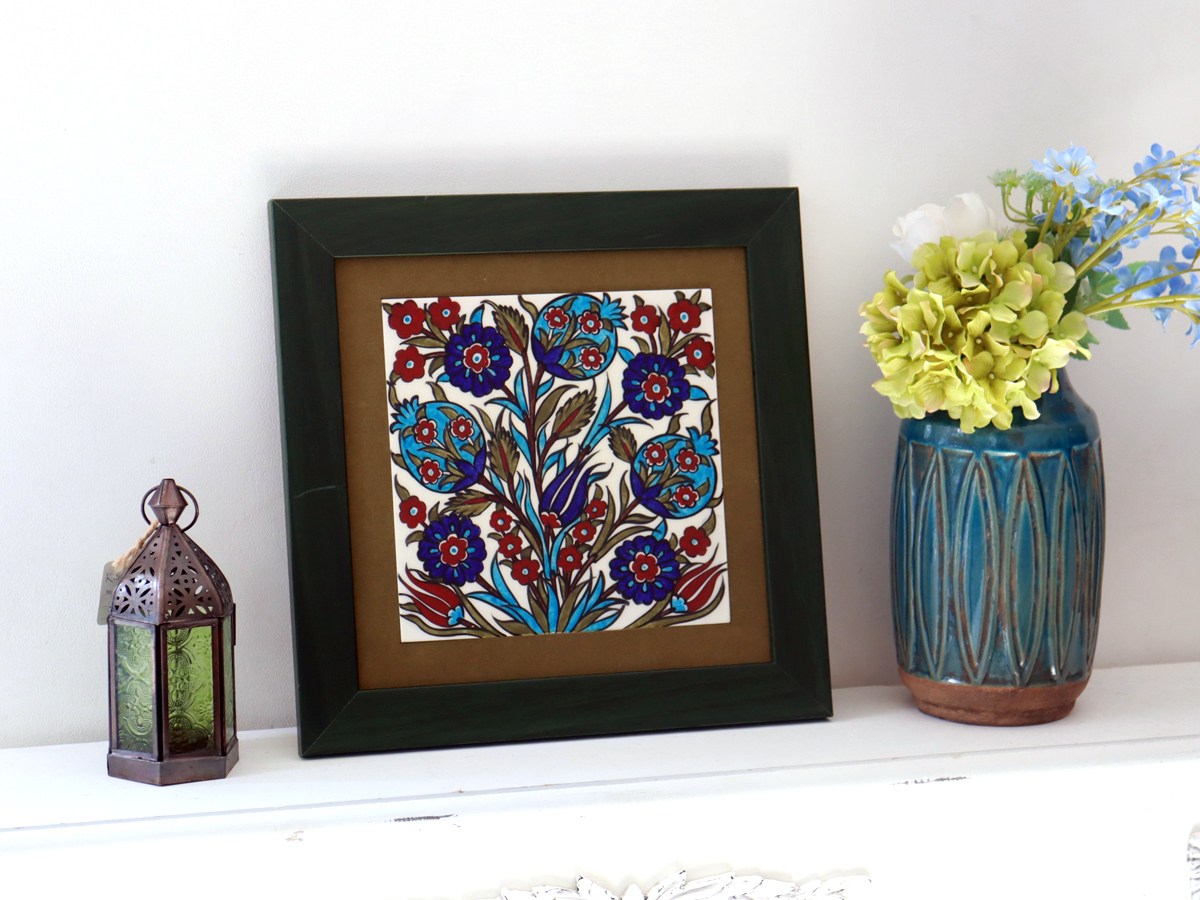 トルコ陶器 手書きタイル 1枚額 H32×W32×D1.5cm チューリップ&カーネーション Turkish Hand Paint Tile