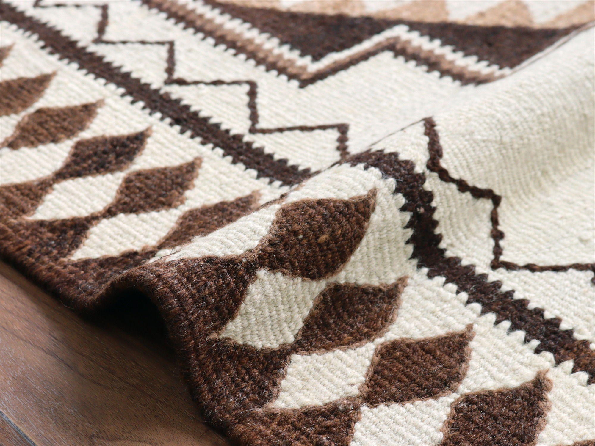 トルコ北東部、カルス地方で織られたキリム。今回、似たようなデザインのキリムがまとまって入荷していますが、もともと大判だったものをカットすることによりこちらの大きさになりました。ベージュベースに幾何学モチーフとメダリオンが織られていますが、枠とモチーフのデザインが途中で途切れていて、もともとは細長いサイズのキリムであったことがわかります。