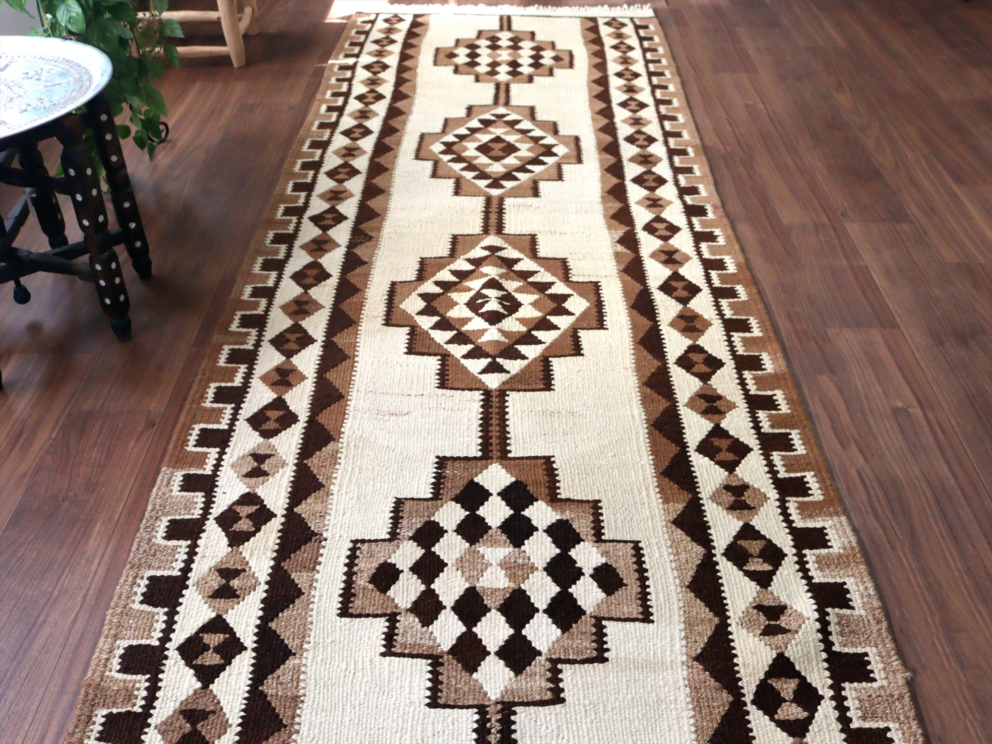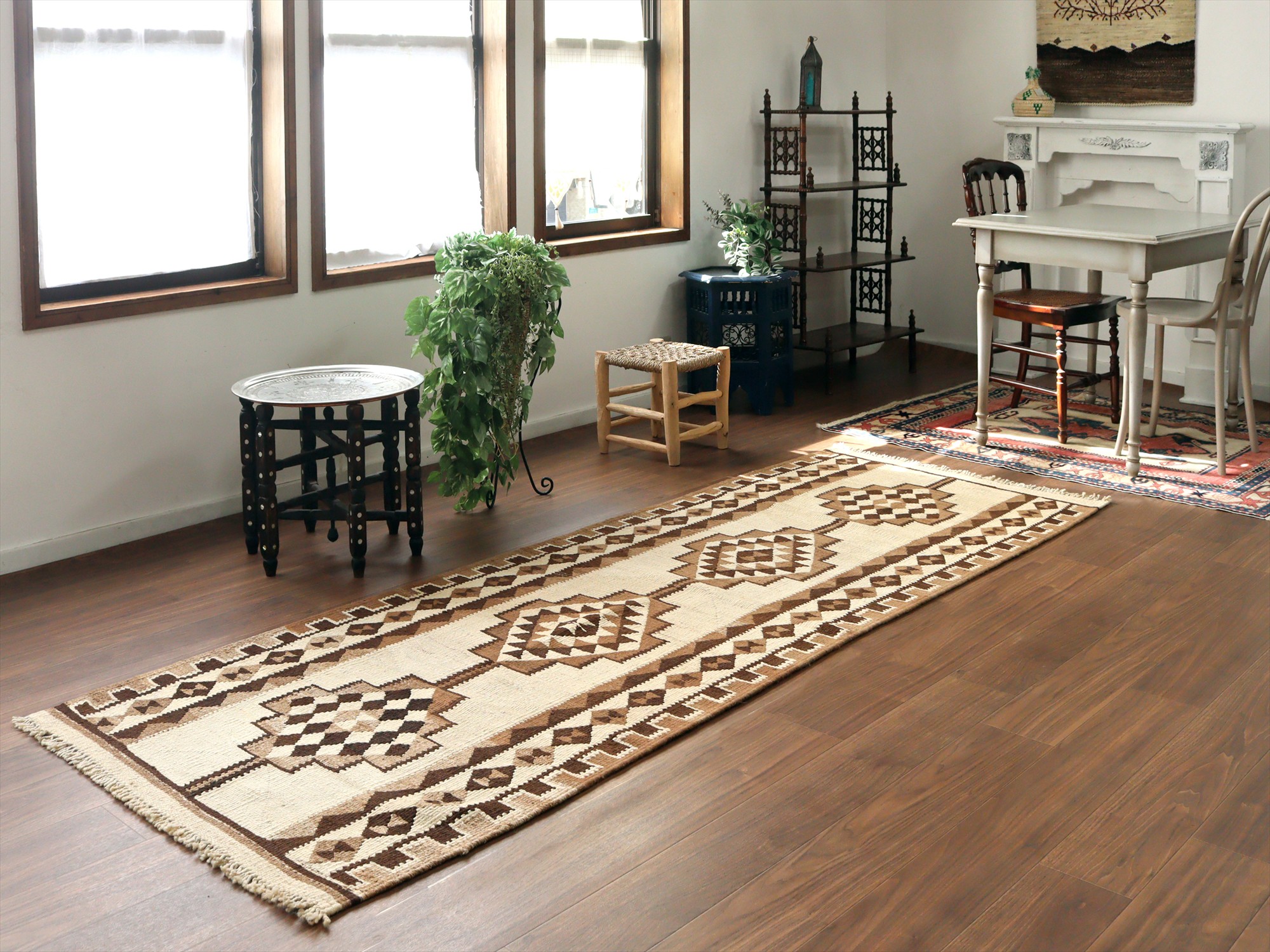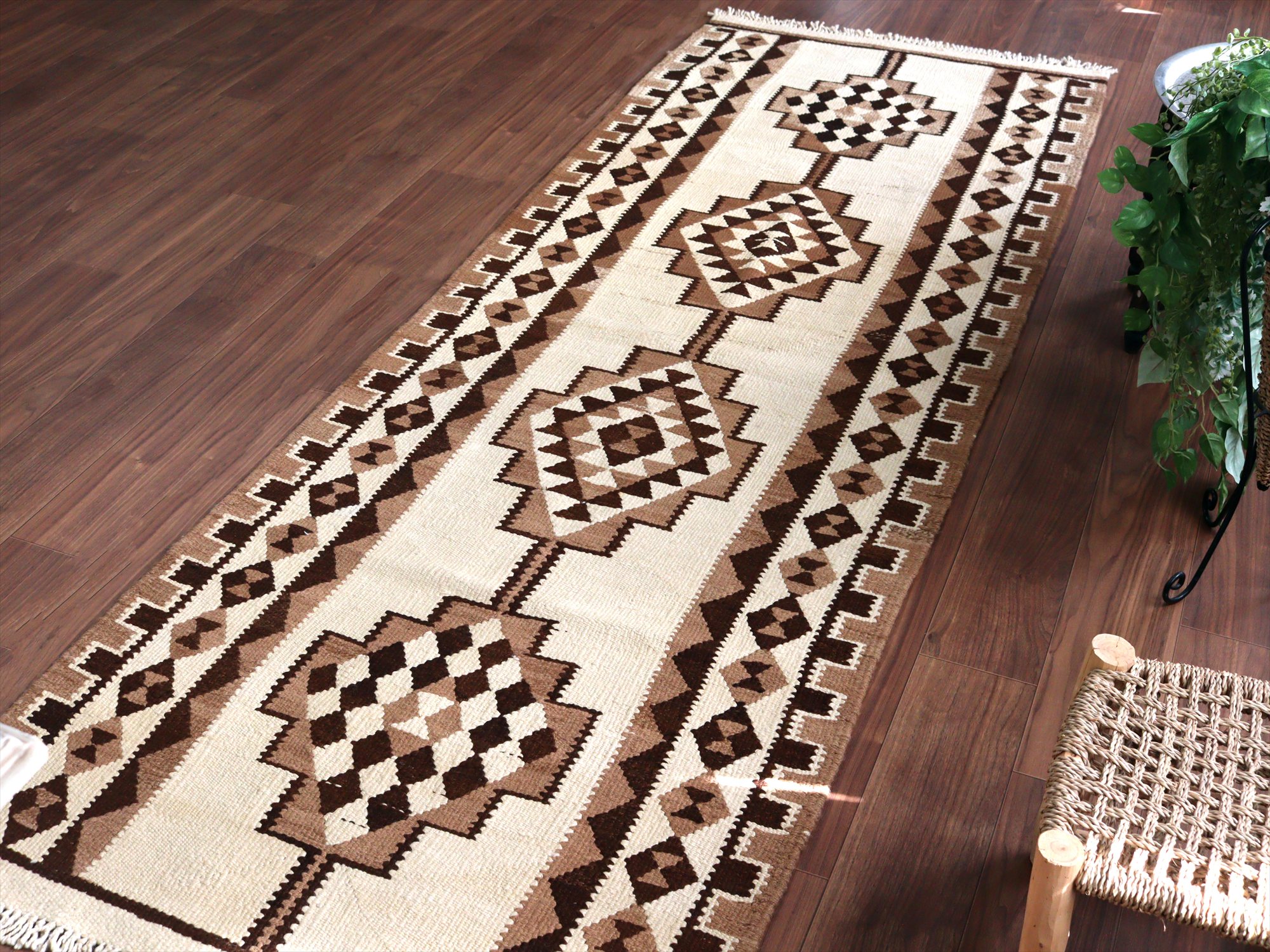 - トルコの手織りキリム カルス277×96cm メダリオンと幾何学モチーフ