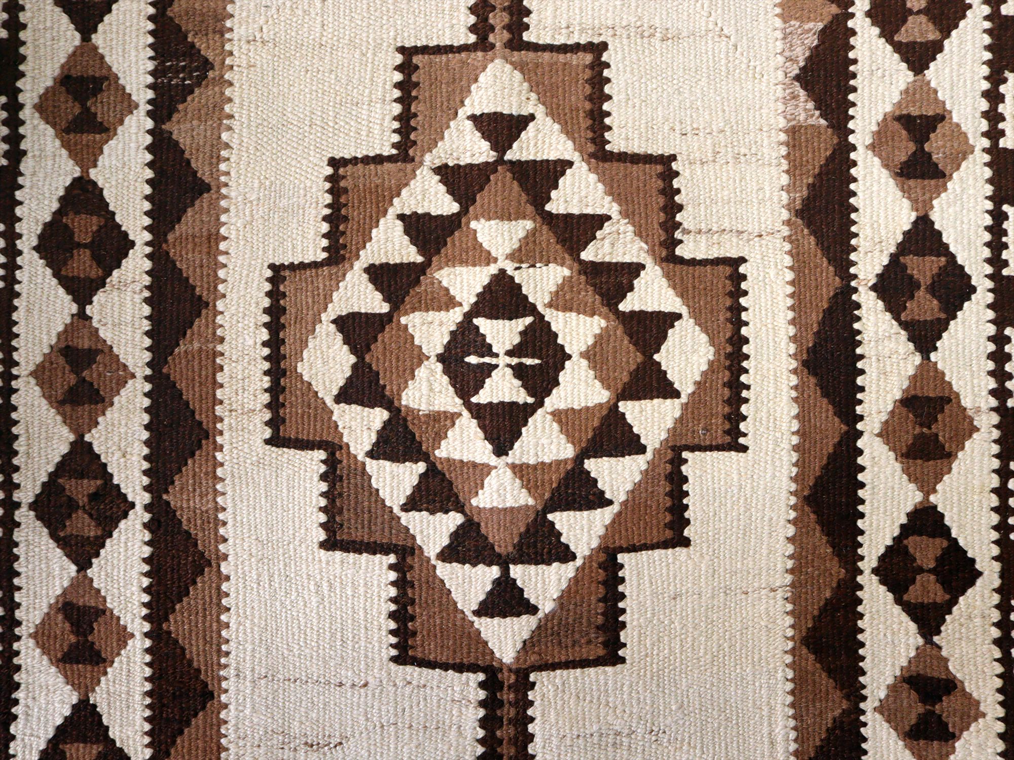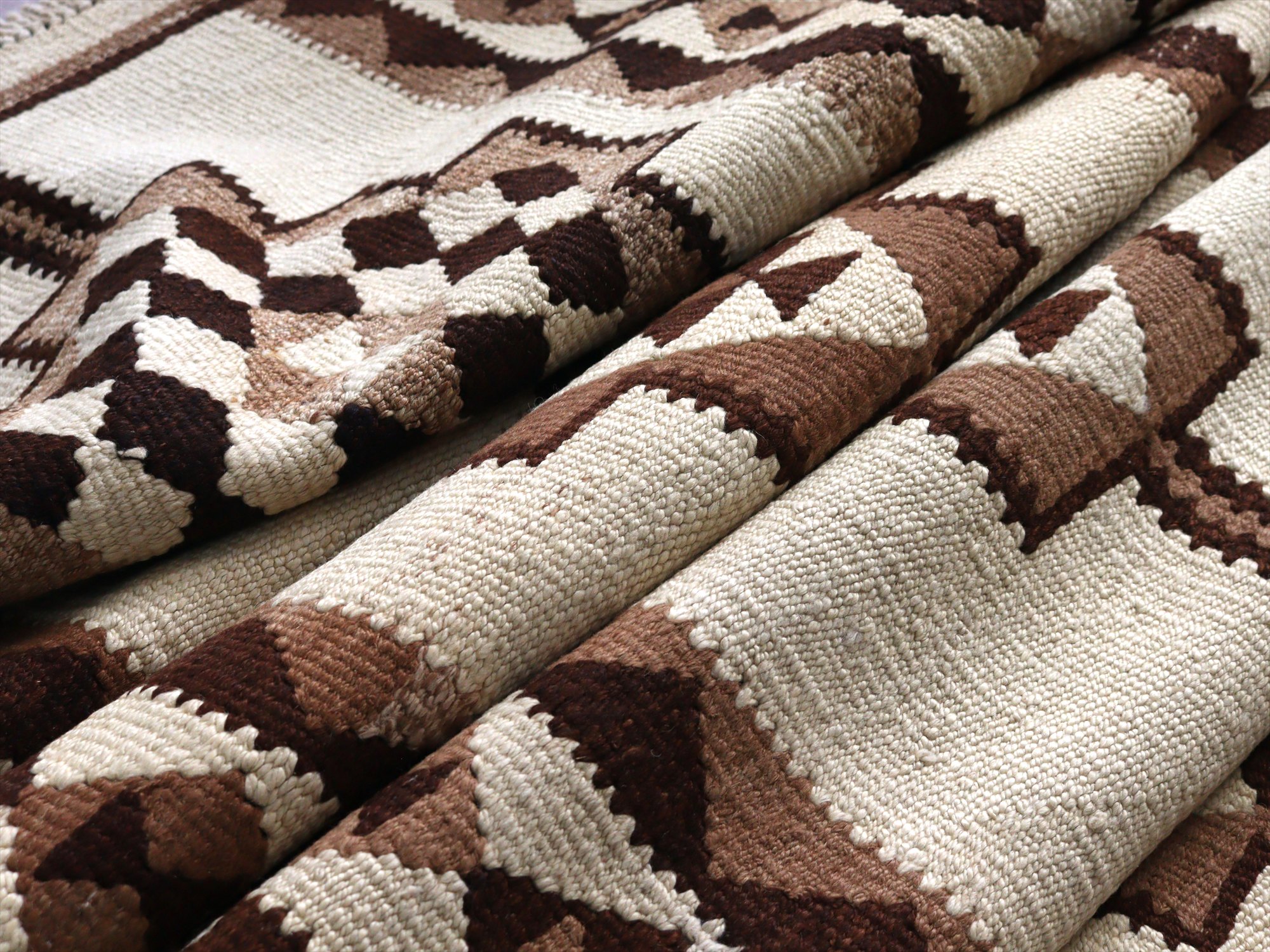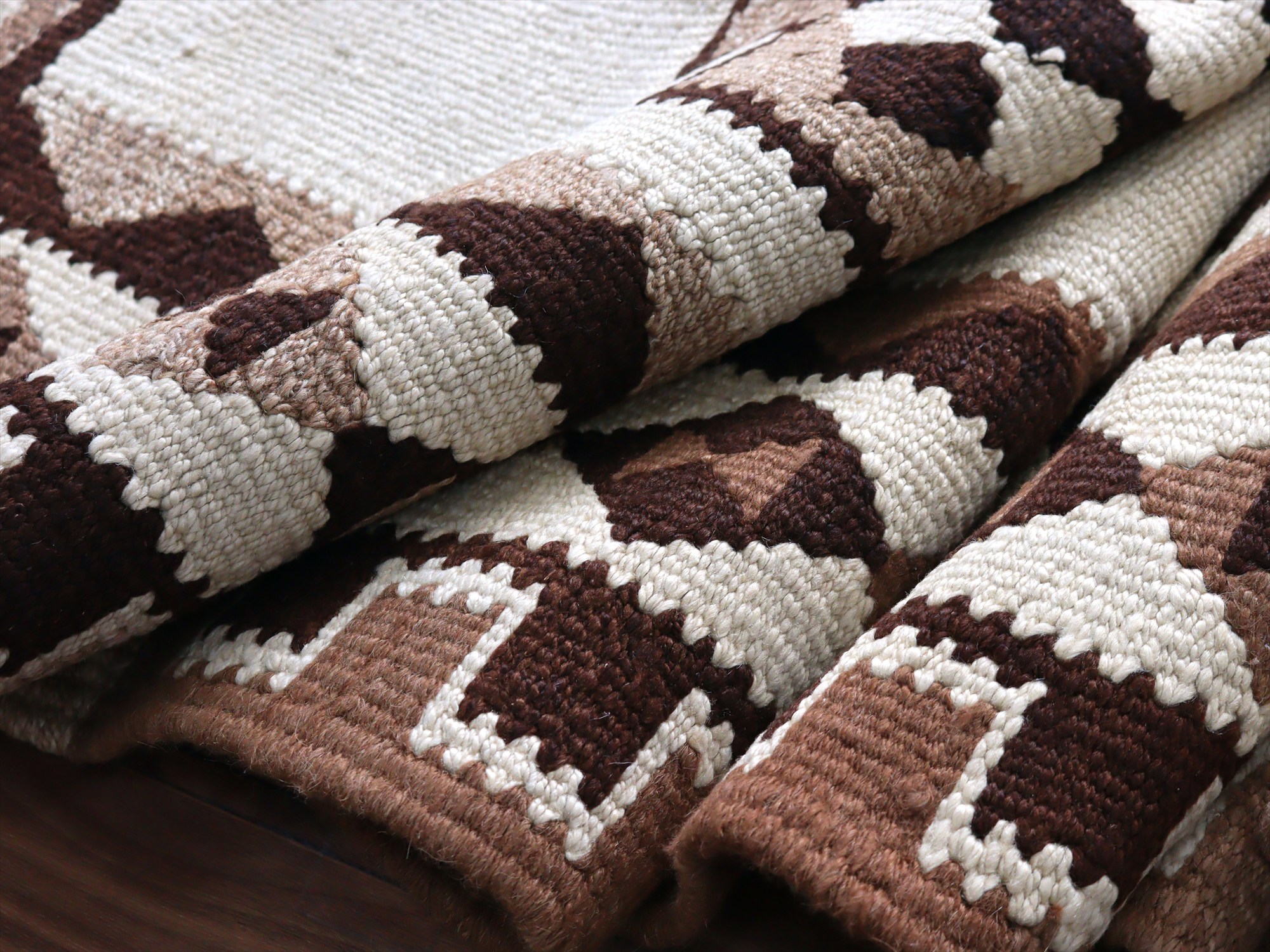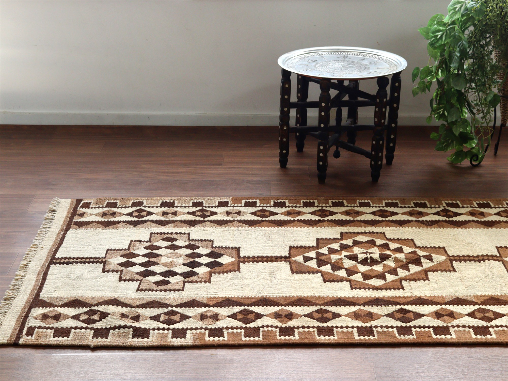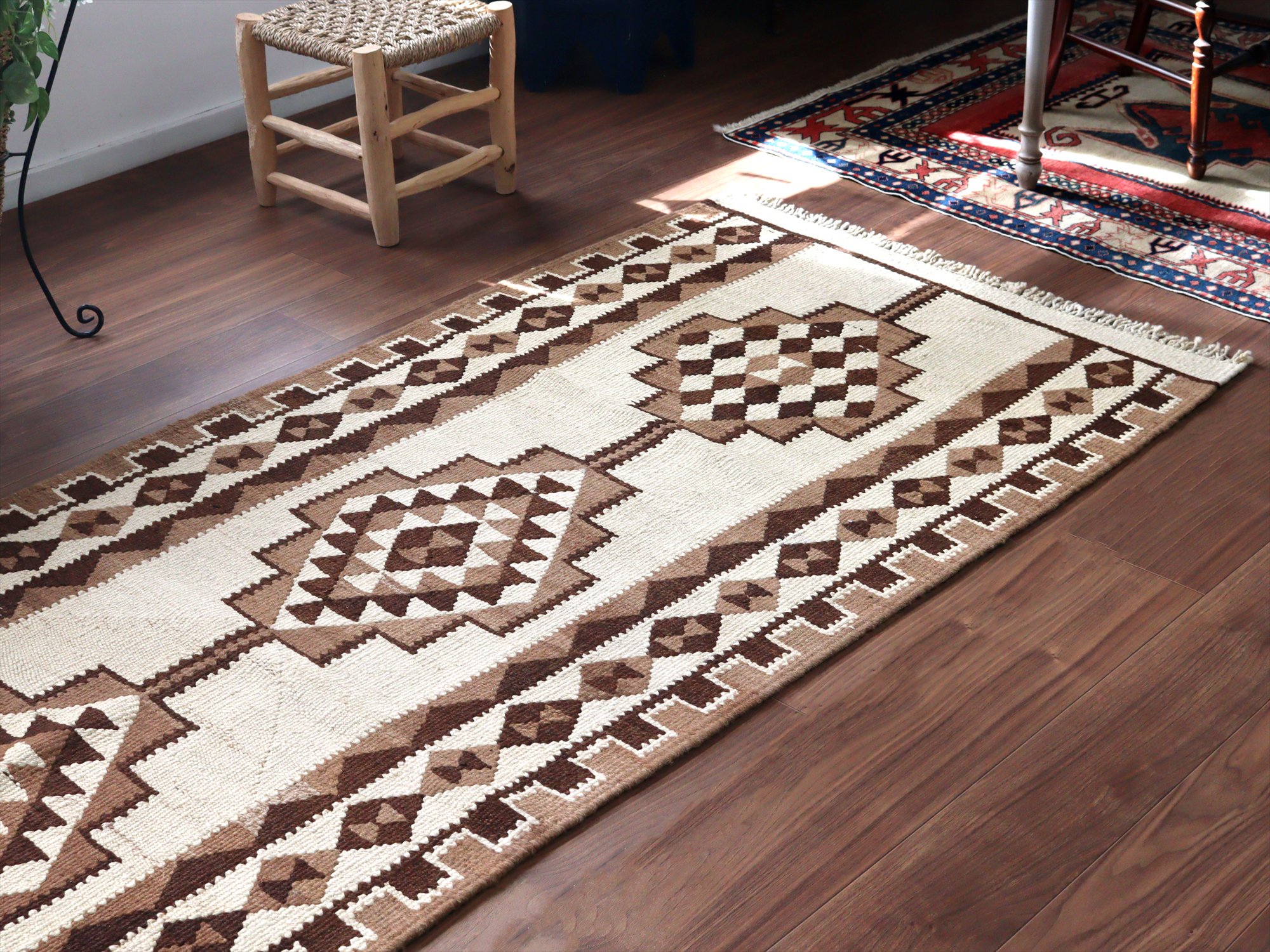 トルコ北東部、カルス地方で織られたキリム。今回、似たようなデザインのキリムがまとまって入荷していますが、もともと大判だったものをカットすることによりこちらの大きさになりました。ベージュベースに幾何学モチーフとメダリオンが織られていますが、枠とモチーフのデザインが途中で途切れていて、もともとは細長いサイズのキリムであったことがわかります。