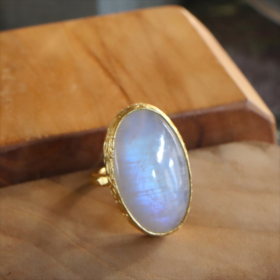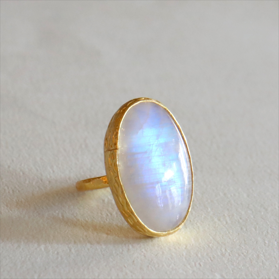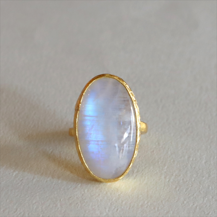 乳白色の大粒の石に幻想的な青みあるシラー(虹色の輝き)が美しい、存在感のあるリングです。ぽってりとボリューム感あるムーンストーンは艶やかで上品な印象です。