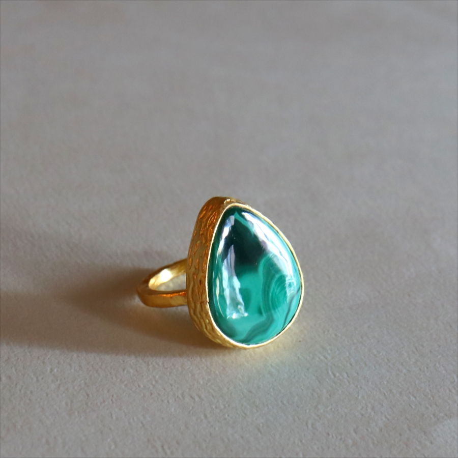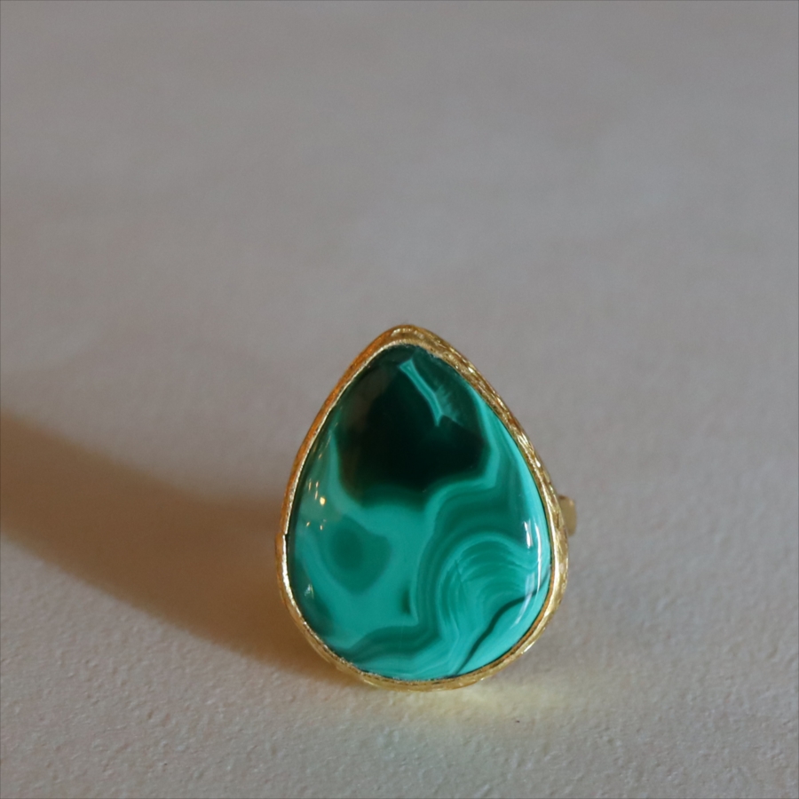 大粒のマラカイトを引き立てるため、デザインはあえてシンプルに。大胆なのにどこか落ち着きがあり、指先にしっくりなじむバランス感も魅力です。