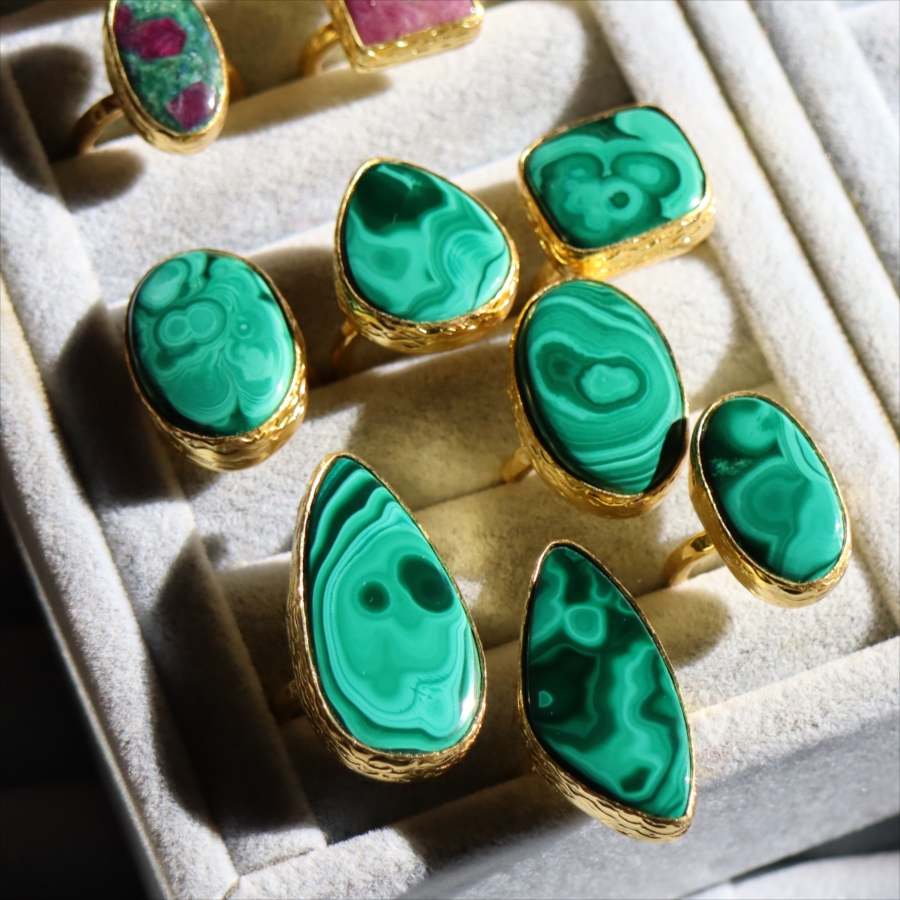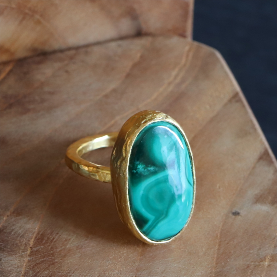 大粒のマラカイトを引き立てるため、デザインはあえてシンプルに。大胆なのにどこか落ち着きがあり、指先にしっくりなじむバランス感も魅力です。