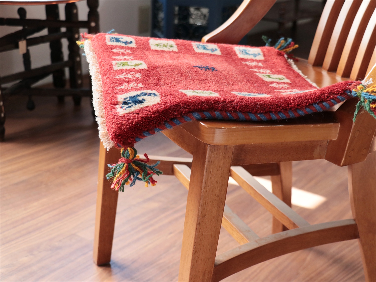何枚も集めたくなる、40cm角の座布団サイズギャベ。四隅に大きなポンポンのついた、伝統的なスタイルでおられています。フローリングに並べて座布団がわりに使ったり、ベンチやダイニングチェアの座面など、使い方はいろいろ。壁にタペストリーのように飾るのもおすすめです。